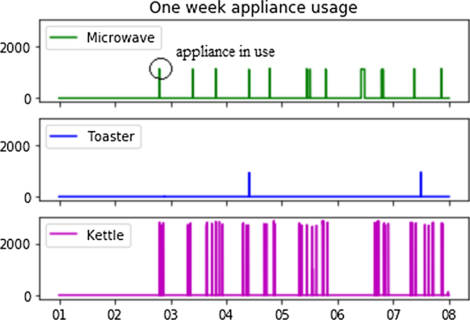 The energy consumption data is sent to the server from smart plugs periodically. In the case of the current cost smart plug, it sends data after every 6 \(\sim\) 8 seconds. Figure 4 presents one-week data stream for ‘Microwave’, ‘Toaster’, and ‘Kettle’.