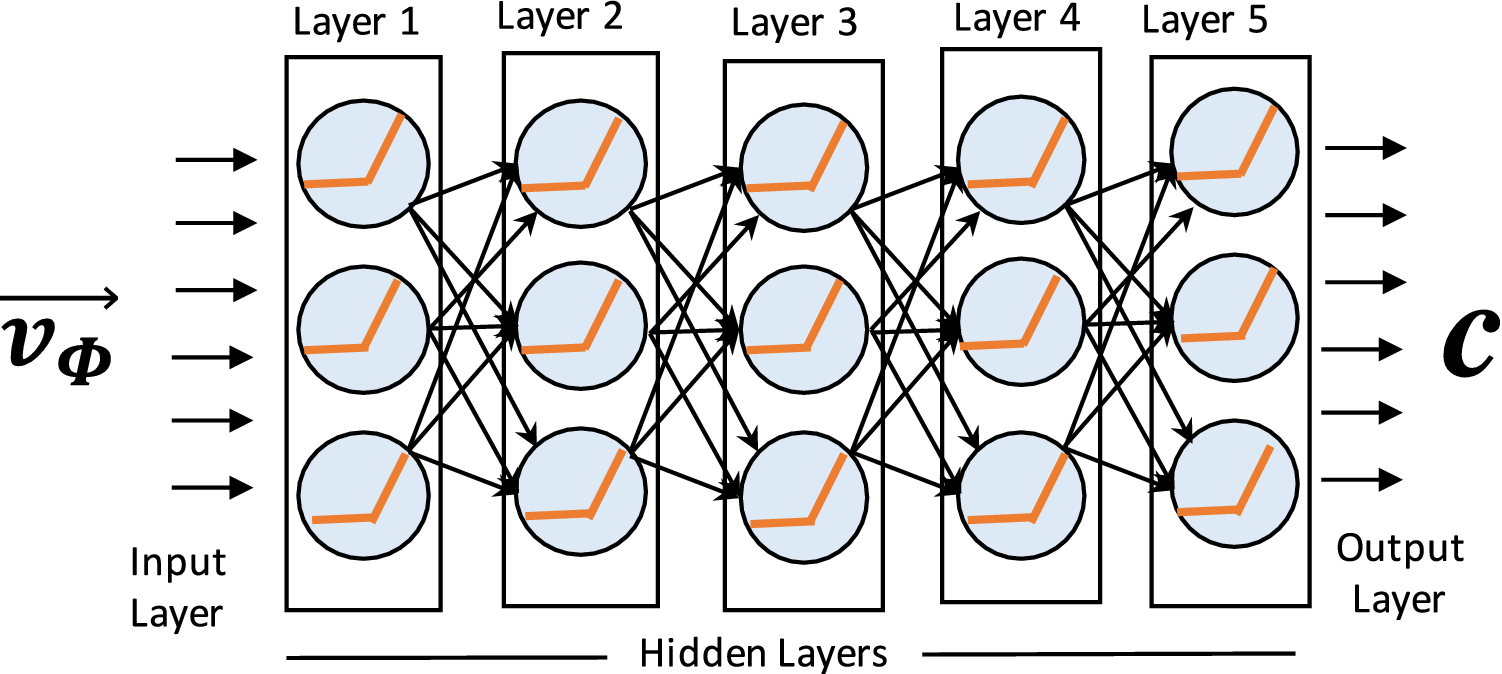 In Fig. 5, architecture contains input and output layer with five hidden layers. The feature vector \(\mathbf {v_\phi }\) is connected to every neuron in first layer \(l_{i}\) and every subsequent layer is fully connected to \(l_{i+1}\) with \(i \in \left[ 1, L \right]\). A weighted sum is calculated over each neuron and non-linearity is applied to squash the strengths.