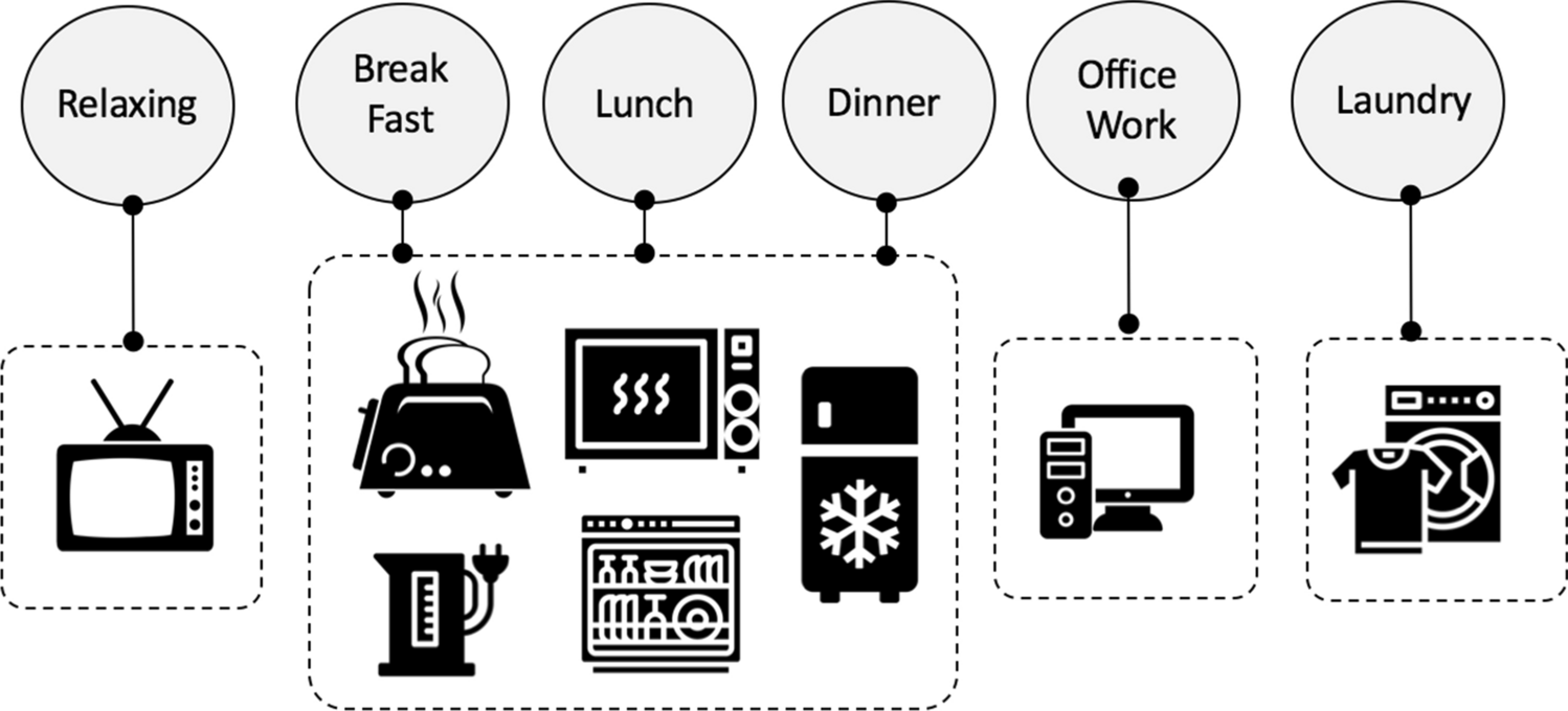 The activities of daily living and behavior can be recognized intrusively using video camera [6] and embedded sensors over the home appliances [7, 8]. However, several problems are associated with these approaches; for instance, video cameras are not practical due to privacy reasons. Similarly, home appliances are not designed to share their interaction patterns and usage. To make them a smart appliance, sensors are placed over the appliances, which put an extra layer of tiny sensors that may complicate interaction with them. An alternative solution is Non-Intrusive Appliance Load Monitoring (NIALM) that is based on a smart meter to disaggregate the load to recognize the individual appliances [9]. However, energy disaggregation is an extremely challenging problem [5] when various appliances are working simultaneously. Similarly, such a solution has adoption limitations because instalment of the smart meter is related to service providers not the residents of the house.
