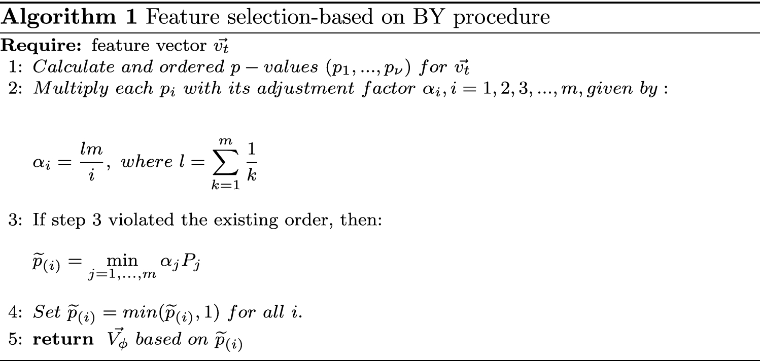 In a hypothesis test, each feature vector \(\mathbf {v_t}\) is evaluated individually and independently with respect to its significance for the classification of home appliances. The result of these tests is a vector of p-values, computing the implications of each feature for predicting the home appliance. In order to decide which features to keep, this vector is evaluated on basis of the Benjamini-Yekutieli(BY) procedure [27]. The BY is a statistical procedure that facilitates to avoid false-positive rate. The procedure pseudo code is presented in the following algorithm 1