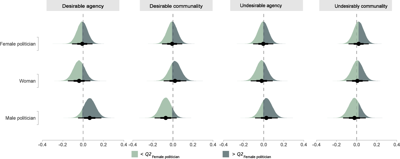 Posterior distributions of trait expectations for female politicians, women, and male politicians. Dots represent posterior median along with 95% (thick) and 66% (thin) credible intervals (CrI). Darker (lighter) colors indicate the probability of values that are higher (lower) than the posterior median of female politicians (Color figure online)