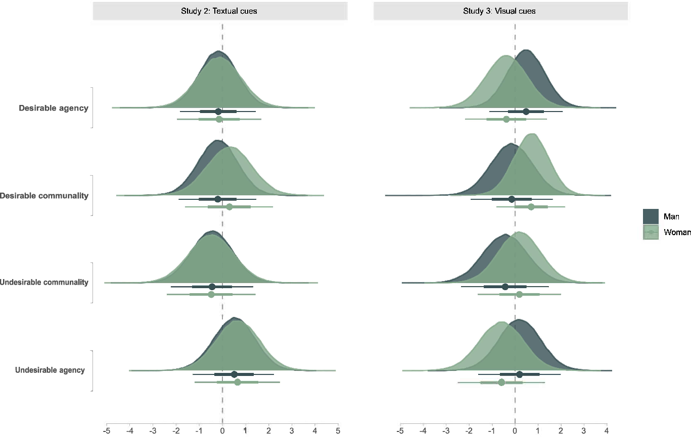 Figure 2 depicts voters’ inferences of stereotypical traits in candidates in absence of other individuating information. The results for study 2 suggest that textual gender cues do not result in incongruent trait inferences. Instead, the strong overlaps in trait inferences for the woman and man candidate (all \(\widehat{\eta }\) > 0.9) show that voters make similar baseline assumptions about women and men’s desirable and undesirable personality traits (BF10 between 0.96 and 1.93 for all outcomes).