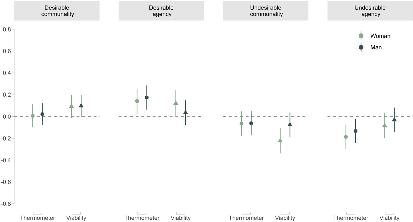 We first turn to agentic traits that are incongruent with gender norms for female politicians. Contrary to expectation (H3b), voters similarly reward female and male politicians emphasizing desirable agentic traits (e.g., assertive and competent; BF10 = 0.5). I find no evidence for gender differences in evaluations of viability for desirable agency (BF10 = 0.7). In line with my expectation (H3a), voters tend to punish female politicians more strongly for possessing undesirable agentic qualities that collide with their gender norm (e.g., stubborn and intimidating). Specifically, voters report lower thermometer ratings for the female politician displaying these traits (BF10 = 2.0) and rate her as less viable than their male counterpart (BF10 = 4.5). In summary, voters accept women with desirable agentic traits but penalize them more strongly than men for having undesirable agentic traits.6