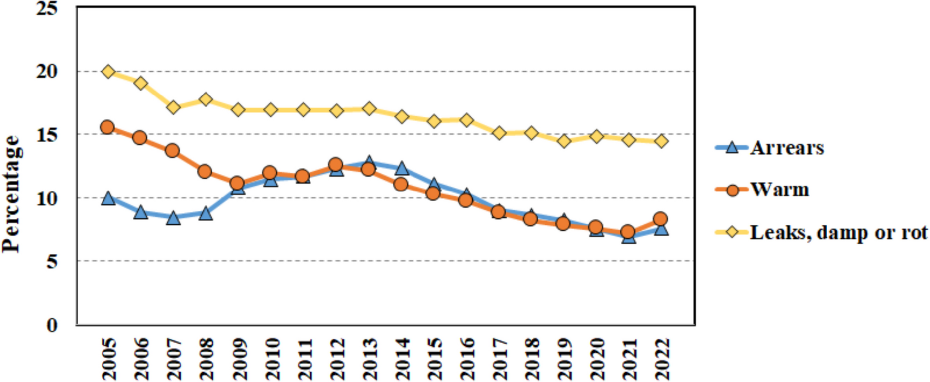 A significant percentage of households in Europe seem to cope with infrastructure problems, as presented in Fig. 1, due to leaks, damp, and rot, followed by an inability to warm (or cool) households, and arrears on utility bills. Unsurprisingly, after the financial crisis of 2007–2008 there is a rising trend in the following years in the arrears and the inadequately warm households. Overall the percentage of households that deal with these issues seems to have been significantly shrunk; for instance, the variable “leaks, damp or rot” in 2005 was about 20% and nowadays has reached 15%, possibly due to measures that focus on the diminishing levels of energy poverty (Fig. 1).