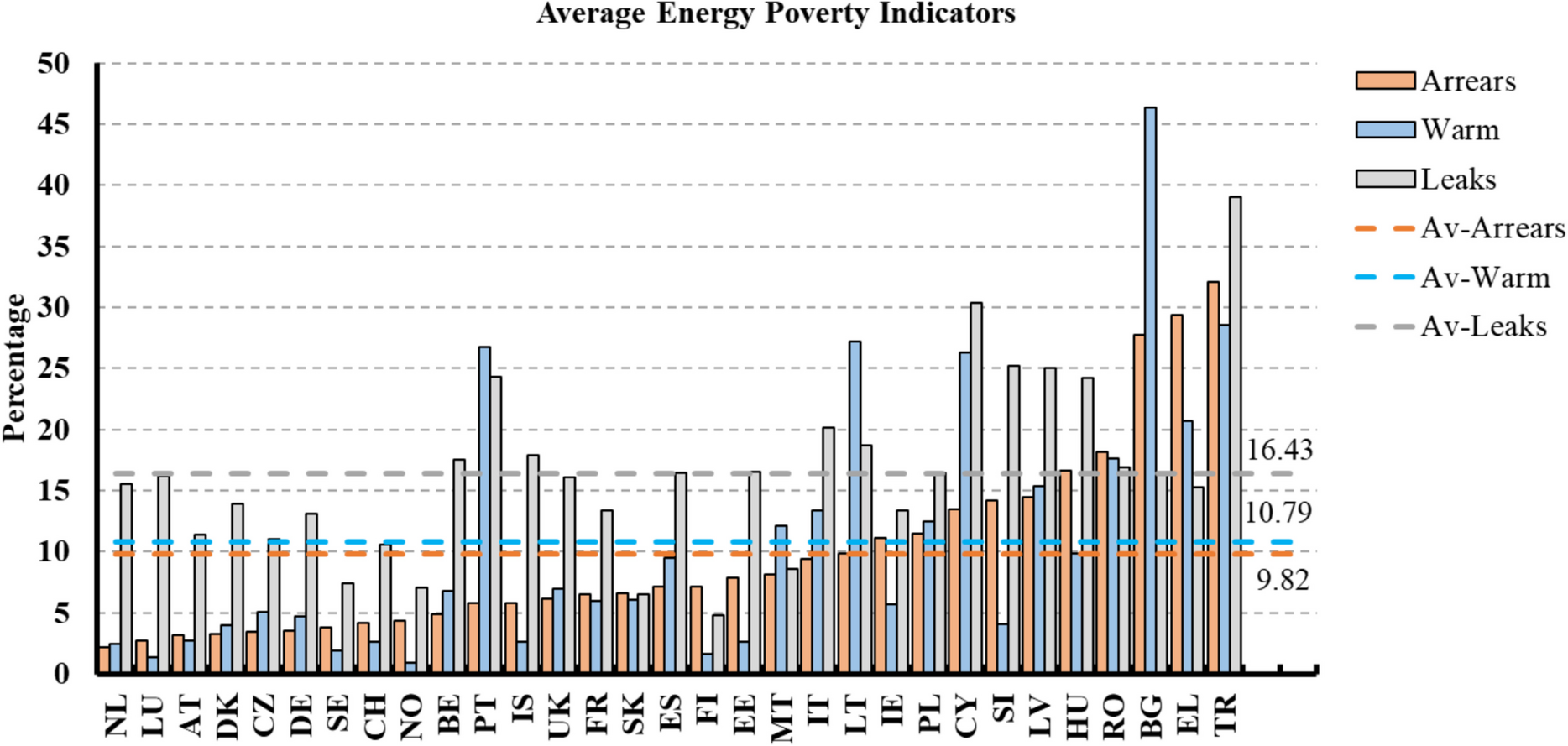 The aspects that have been presented regarding these three energy poverty indicators are the reasons why these three indicators have been selected in the present research. In essence, these three parameters show the adequacy for monitoring energy poverty in line with societal phenomena such as energy justice, as no one should live under these conditions. Next in order, the average household conditions in 31 European countries are illustrated in Fig. 2, showing the vulnerability of households to energy poverty characteristics.