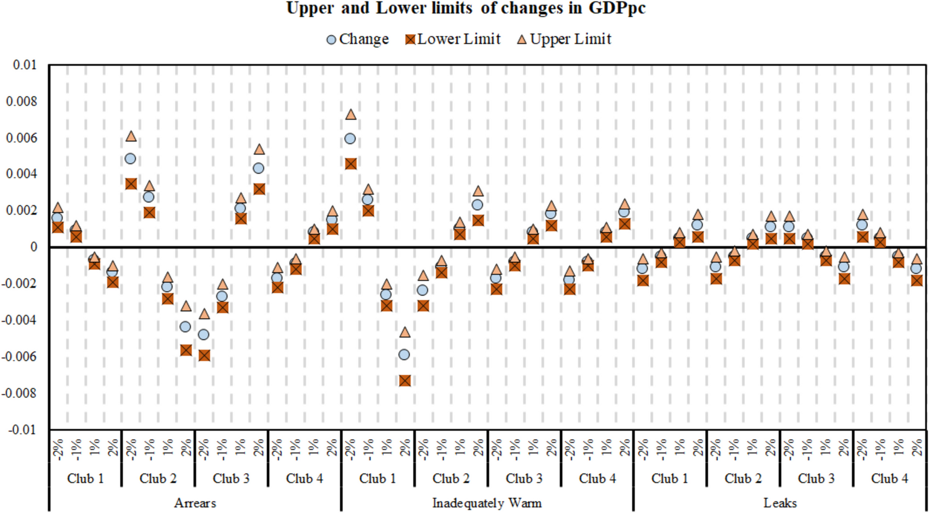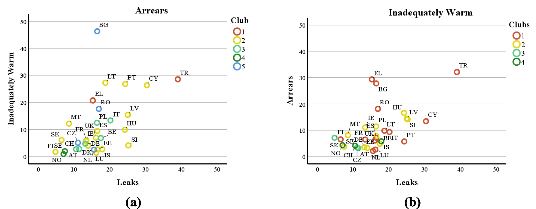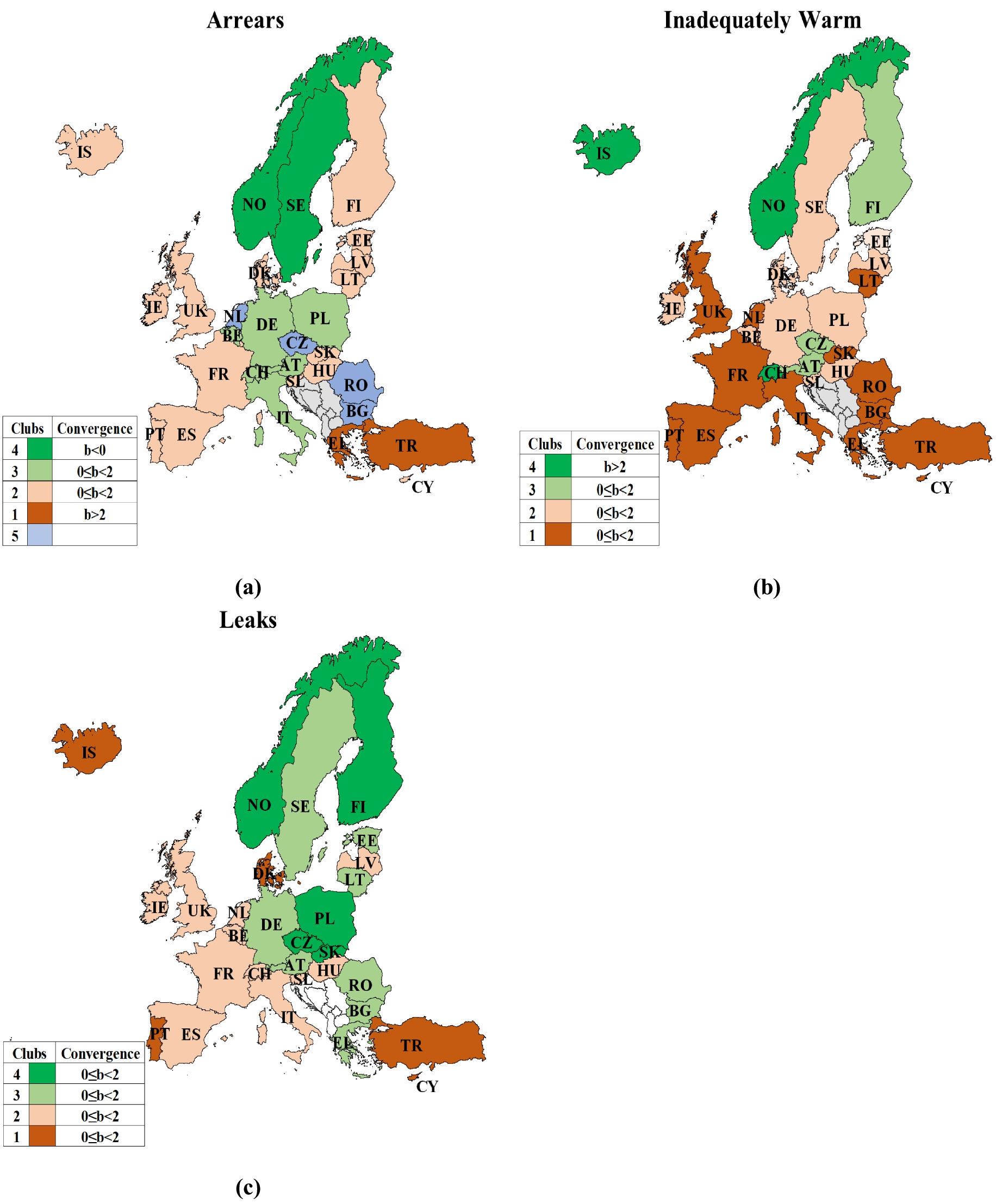 More specifically, there is absolute level convergence in 2 of the 8 final clubs (Club 1 of Arrears and Club 4 of Inadequately Warm), and there is a conditional convergence in 5 of the 8 final clubs (Club 2, 3 of Arrears; Club 1, 2, 3 of Inadequately Warm) and in the 4 initial convergence clubs of the Leaks. Lastly, in Club 4 of the Arrears indicator, the countries show the weakest convergence. The results were further explained by implementing a robustness analysis based on ordered-logit regression results on club formations based on changes of GDPpc, a relevant and pivotal indicator for energy poverty. Regarding the second research question, the results showed that there is a core-peripheral geographical distribution on the “Arrears” indicator, whereas the indicators “Inadequately Warm” and “Leaks” have a North–South convergence pattern.