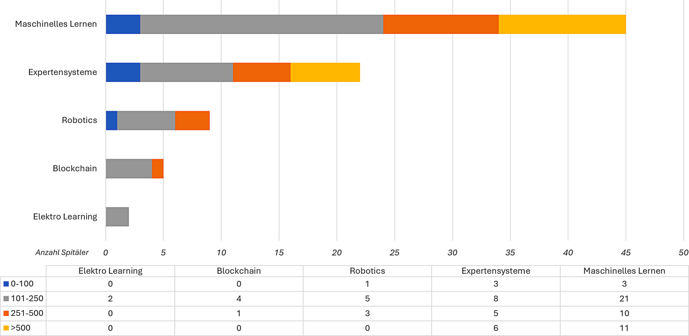 Aktueller Einsatz von KI-Technologien (Farben gemäß Anz. Betten, Mehrfachnennung, N = 45)