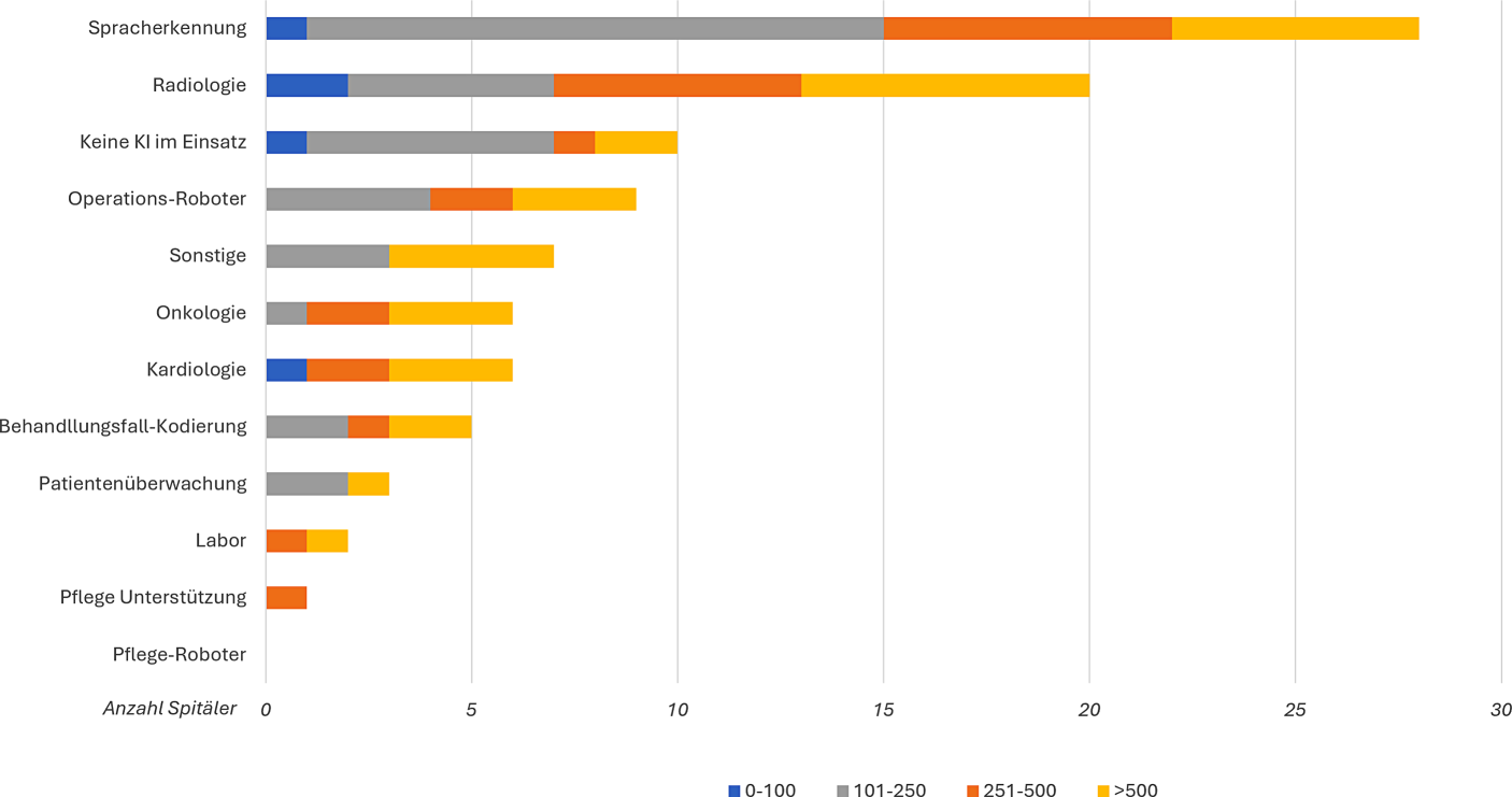 Beim Einsatz von bekannten KI-Technologien und -Systemen (Abb. 3) dominiert offensichtlich die Spracherkennungssoftware, für den medizinischen Bereich liegt der Schwerpunkt in der Radiologie von Spitälern aller Betriebsgrössen. Gemäß den befragten Experten:Innen ist die Verwendung hochpreisiger Operationsroboter erst in größeren Spitälern vorhanden, wobei Pflegeroboter noch nicht eingesetzt werden. Als dritthäufigste Antwort wurde „keine KI-Lösungen“ angegeben und dies lässt laut Experteninterviews vermuten, dass den befragten Personen der KI-Einsatz nicht bewusst ist. In die Rubrik „Sonstige Einsatzbereiche“ fallen Sonderfälle wie z. B. IT-Security Lösungen mit KI-Features.