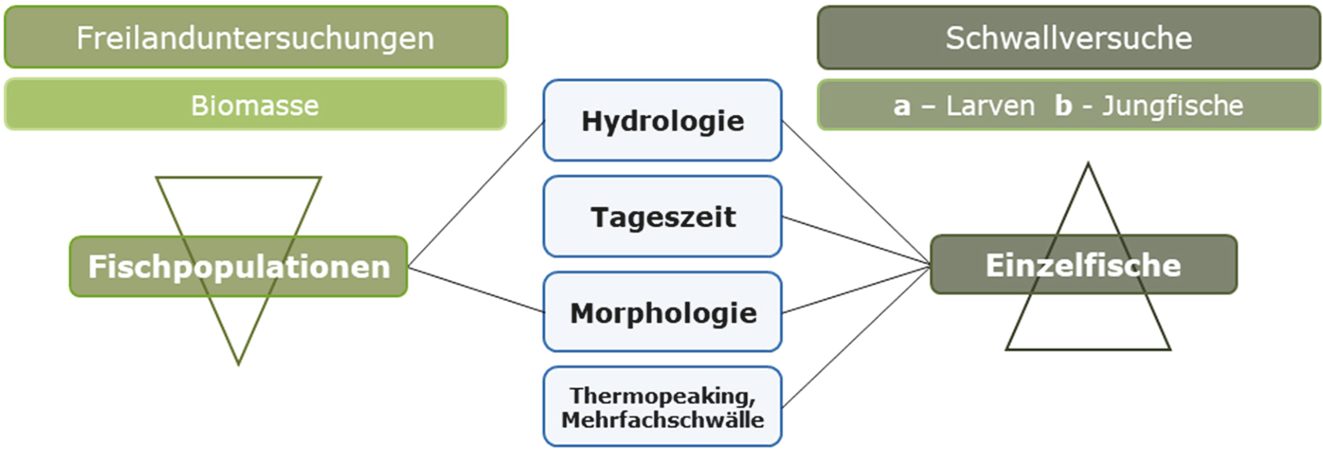 Zur Untersuchung der Effekte kurzfristiger Abflussschwankungen auf Cypriniden wurden zwei Methodenansätze herangezogen: (1) Datenbankanalysen österreichischer Befischungen zur Zustandserhebung von Fischpopulationen sowie (2) Schwallversuche in naturnahen Fließrinnen zur Quantifizierung individueller Effekte (Abb. 1).