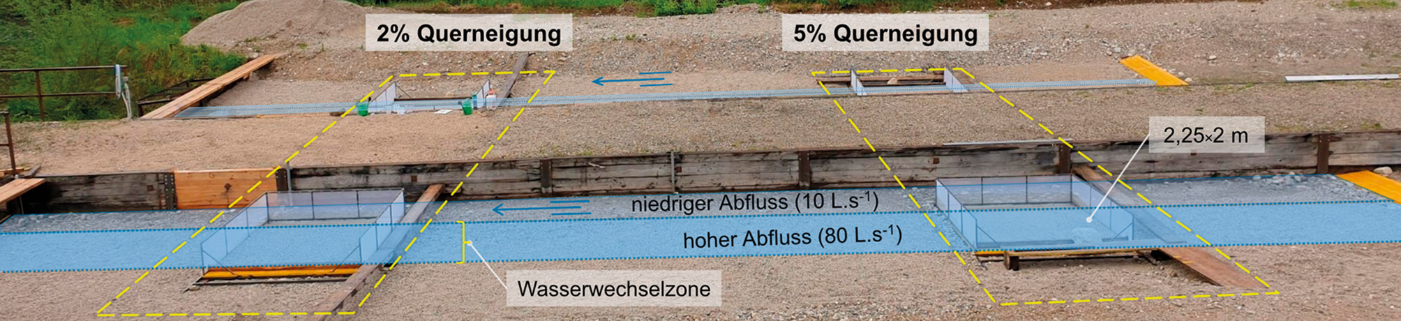 Im Jahr 2022 wurden zudem Versuche mit juvenilen Nasen (Körperlänge: 23–30 mm) bei wiederkehrenden Schwallereignissen und unter natürlichen Schwankungen der Wassertemperatur bei Tag und Nacht durchgeführt (Auer et al., in Vorbereitung). Diese Versuche fanden direkt in den Versuchsrinnen statt, um sowohl die Auswirkungen auf die Drift zu quantifizieren als auch die Präferenz von Jungnasen für heterogene Kiesbankstrukturen in Form eines Hinterrinners zu untersuchen. Der Ablauf dieser Mehrfachschwallversuche umfasste folgende Schritte: (i) Besatz von 150 Individuen bei einem geringen Durchfluss (25 L ⋅ s−1), (ii) Akklimatisierung der Fische, (iii) programmierte Durchflusserhöhung mit konstanter Anstiegsrate, (iv) hoher Durchfluss (Schwall: 125 L ⋅ s−1), (v) programmierte Verringerung des Durchflusses auf 25 L ⋅ s−1 mit einer konstanten Abstiegsrate von 1,5 cm ⋅ min−1. Die Drift wurde für jeden einzelnen Schritt gemessen, und die trocken gefallene Kiesbank sowie der Hinterrinner wurden nach gestrandeten Individuen abgesucht. Die nicht gedrifteten und nicht gestrandeten Jungfische verblieben in der Versuchsrinne, und die Schritte ii–v wurden anschließend mindestens zweimal wiederholt.