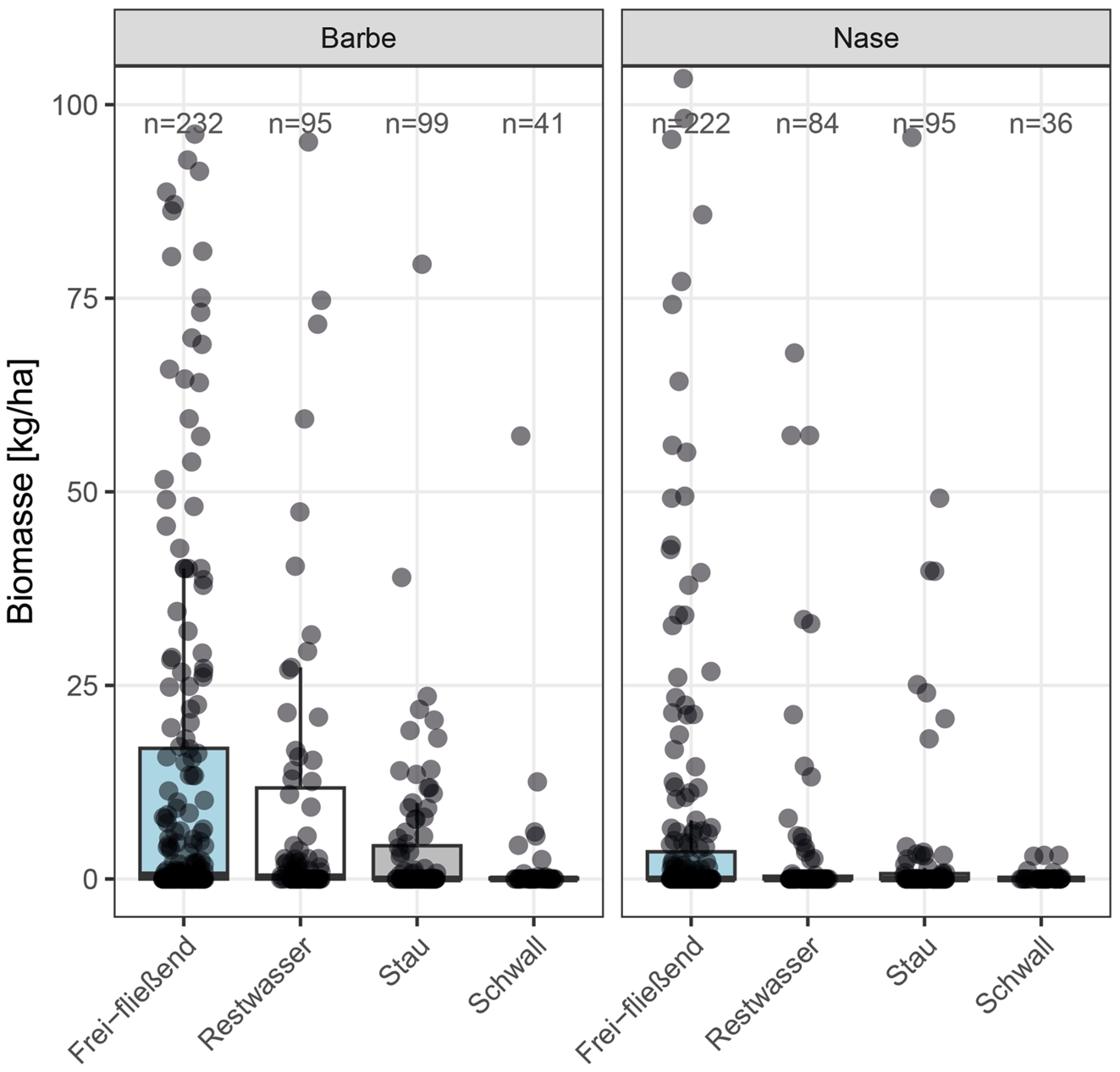 Biomasse der Zielarten Barbe und Nase in österreichischen Fließgewässern. Median: Barbe = 0,02 kg ⋅ ha−1, Nase = 0,0 kg ⋅ ha−1. Ausreißer > 100 kg ⋅ ha−1 wurden zur besseren Lesbarkeit grafisch abgeschnitten (Barbe: n = 20, max = 682 kg ⋅ ha−1; Nase: n = 15, max = 1076 kg ⋅ ha−1) (Daten: Hayes et al. 2022a)