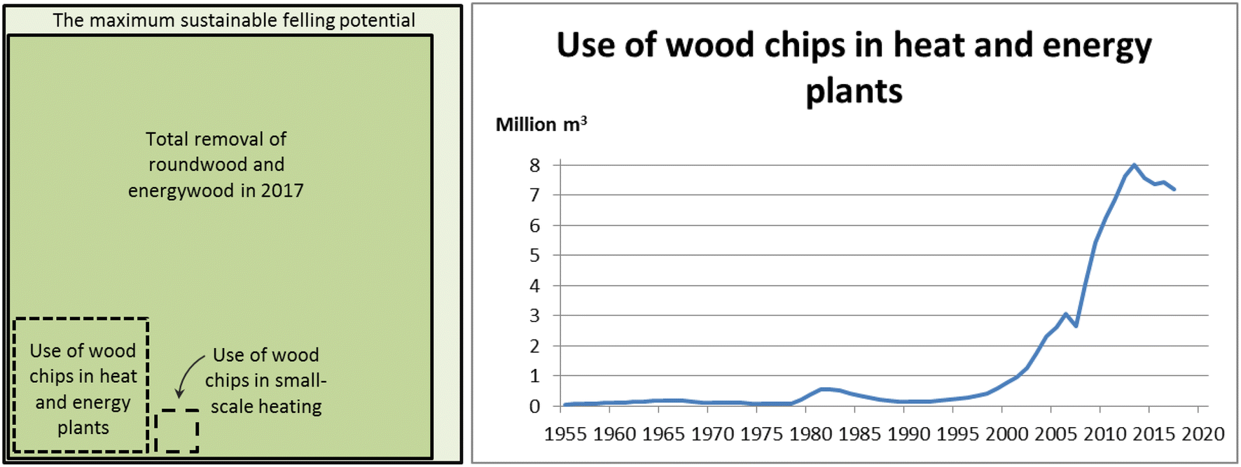 Total forest use in 2017 (left panel) and the long-term development of the energy use of wood chips in Finland (right panel) (Hakkila et al. 2001; Hakkila 2005; LUKE 2018a, b)