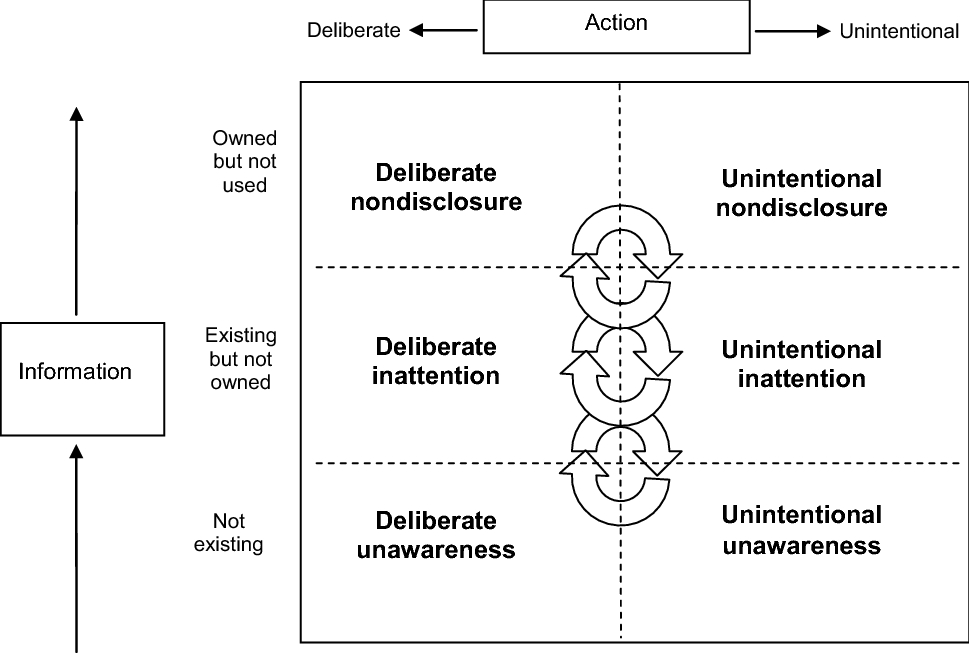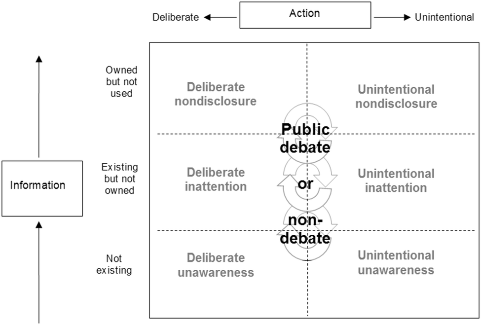 The framework highlights that the state of not knowing can be deliberate or unintentional. First, deliberate nondisclosure occurs when an actor possessing the information restricts communication or refrains from communication altogether. The motivation may be the perceived need to avoid unwanted consequences of information sharing, such as securing commercial or political interests, avoiding the creation of misunderstandings or unnecessary worries among the audience (Mazur 2004; Owens 2017). Deliberate nondisclosure can be passive non-communication or an active dismissal of information requests.