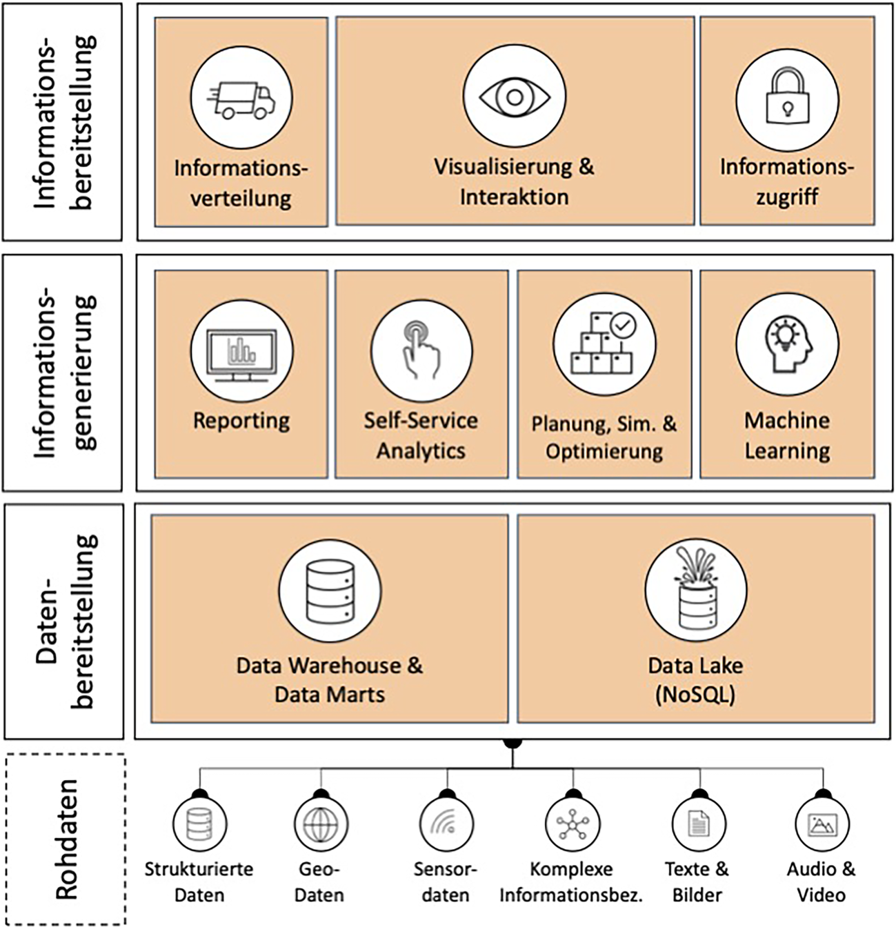 Nachdem die Datenbasis geschaffen wurde, lassen sich zahlreiche Methoden einsetzen, um die bereitgestellten Daten in Information zu transformieren. Die grundlegende Methode von Business Analytics für die Informationsgenerierung ist die berichtsorientierte Analyse (Reporting), bei der ein Spektrum von Berichtstypen standardisiert erstellt und verfügbar gemacht wird. Eine Spezialisierung erfährt diese Methode durch Self-Service Analytics. Hierbei greifen die Endanwender auf die Daten zu, um eigenständig Analysen durchzuführen und Berichte zu erstellen. Daneben werden als weitere Methoden zur Informationsgenerierung das maschinelle Lernen sowie Methoden der Planung, Simulation und Optimierung verwendet. Sie erlauben es, zukünftige Ereignisse zu prognostizieren bzw. mithilfe von Optimierungsverfahren die besten Handlungsalternativen zu identifizieren. Die Informationsbereitstellung ermöglicht schließlich durch Visualisierungswerkzeuge eine zielgruppenadäquate und konsistente Präsentation und Verteilung der generierten Informationen.
