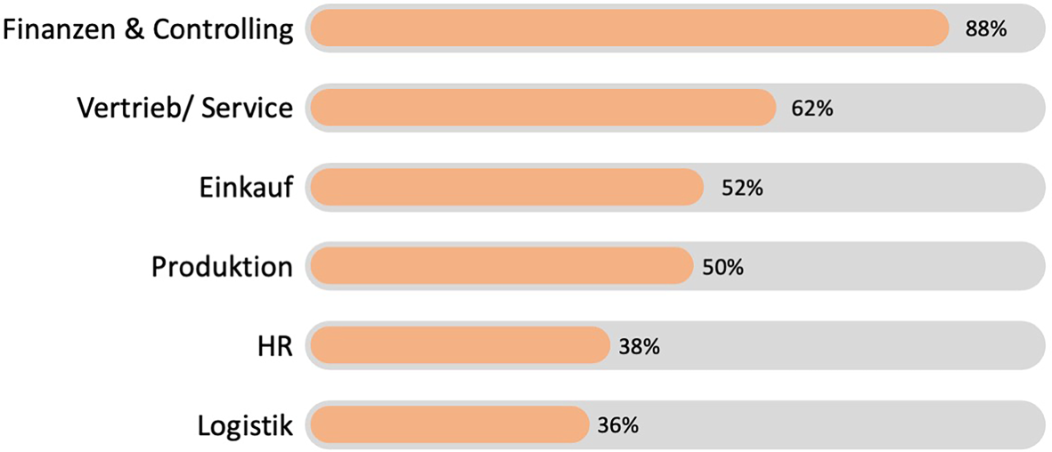 Neben der allgemeinen Verbreitung (horizontale Diffusion) wurde auch der Einsatz innerhalb der befragten Unternehmen (vertikale Diffusion) detaillierter untersucht. Ein Indikator für die vertikale Diffusion ist die Anzahl der Unternehmensbereiche, in denen die Informationsversorgung durch Business Analytics sichergestellt wird. Erfreulich ist mit durchschnittlich 4 Unternehmensbereichen die weite Verbreitung innerhalb der befragten Unternehmen. Historisch gesehen war Business Analytics immer ein Thema, welches aus dem Bereich der Unternehmenssteuerung und des Controllings initiiert worden ist. Wie die Studie aber deutlich macht (siehe Abb. 2), ist es nun auch in anderen Unternehmensbereichen ein fester Bestandteil der betrieblichen Entscheidungsprozesse.