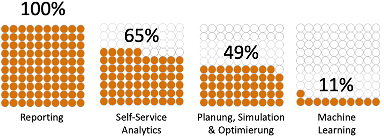 Gemeinsam ist allen Teilnehmern, die angeben Business Analytics zu verwenden, dass Reporting genutzt wird (siehe Abb. 3). Auch Self-Service Analytics (65 %) wird intensiv verwendet, um eigene Auswertungen und Dashboards zu erstellen und damit flexibel auf Informationsbedürfnisse zu reagieren. Im Bereich Planung, Simulation und Optimierung (49 %) konnte vor allem aufgrund der verschiedenen Krisen und der Pandemiesituation eine zunehmende Verbreitung festgestellt werden. In den Ergebnissen der Studie spiegelt sich aber auch wider, dass bei maschinellem Lernen (11 %) noch deutlicher Nachholbedarf besteht. Hier steht eine Fülle von Methoden bereit, die treffsichere Prognose ermöglichen und auch automatisiert Handlungsoptionen aufzeigen. Beispielsweise erlauben intelligente Algorithmen des Data Minings, die Abwanderungswahrscheinlichkeit von Kunden vorherzusagen, den potenziellen Ausfall von Maschinen zu prognostizieren und komplexe Produkt- und Artikelbeziehungen zu analysieren. Dieses Potenzial wird von den befragten Unternehmen nur unzureichend ausgeschöpft.