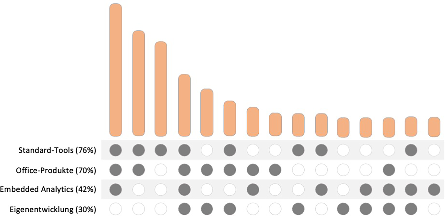 Die konkrete Ausgestaltung von Business Analytics reicht von einfachem Berichtswesen auf Basis von Office-Produkten bis hin zu komplexen Lösungen, bei denen mehrere Tooltypen gleichzeitig genutzt werden (siehe Abb. 4). Allerdings stellt das einfache Berichtswesen ausschließlich mithilfe von Office-Produkten eine Ausnahme dar. Die Studie zeigt außerdem, dass es einen statistisch signifikanten Zusammenhang zwischen Anforderungen und Komplexität der implementierten Lösungen gibt: Je mehr Methoden genutzt werden, desto höher ist auch tendenziell die Anzahl der eingesetzten Tooltypen. Wenn also unterschiedliche Anwendungsbereiche abgedeckt werden sollen, führt dies aufgrund des Best-of-Breed-Ansatzes bei der Softwareauswahl zu weiteren Tooltypen und damit zu komplexeren Business-Analytics-Lösungen.