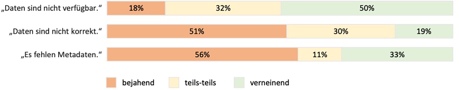Die Verfügbarkeit der relevanten Daten wird moderat beurteilt (siehe Abb. 5): 18 % der Teilnehmer tendieren zur Aussage, dass relevante Daten nicht verfügbar sind, und 32 % sehen hier partielle Probleme. Dramatischer ist die Einschätzung bezüglich der Korrektheit der verfügbaren Daten: Hier geben 51 % der Teilnehmer an, dass es Probleme bei der Qualität der Daten gibt und 30 % sehen hier teilweise Probleme. Nur ein geringer Anteil von 19 % sieht keinerlei Probleme. Ebenso dramatisch fällt die Einschätzung von Metadaten aus: 67 % der Teilnehmer sehen hier erhebliche oder partielle Probleme.