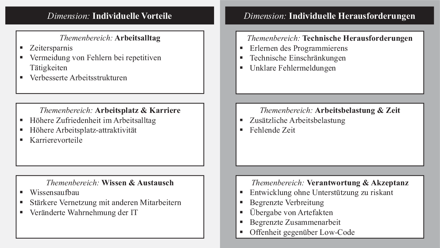 Die Ergebnisse der Forschung untergliedern sich in individuelle Vorteile und individuelle Herausforderungen im Rahmen der Entwicklung und Nutzung von Low-Code-Anwendungen. Im ersten Abschnitt werden in Hinblick auf die erste Forschungsfrage zunächst in der Praxis wahrgenommene Vorteile von Mitarbeitenden in Bezug auf deren Arbeitsalltag, Karriere sowie Wissen und Austausch im Unternehmen dargelegt. Der zweite Abschnitt bezieht sich auf die zweite Forschungsfrage und fokussiert sich auf Herausforderungen in Hinblick auf technische Einschränkungen bei der Realisierung von individuellen Anwendungsfällen sowie die Auswirkungen der zusätzlichen Rolle von Mitarbeitenden als Business Unit Developer auf deren persönliche Arbeitsbelastung und Verantwortungslast. Die Ergebnisse sind in Abb. 1 zusammengefasst und werden nachfolgend ausführlich erläutert.