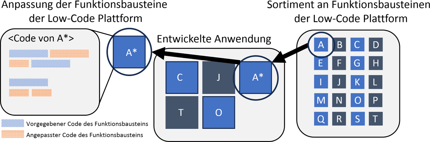 LCE zielt sowohl auf erfahrene Softwareentwicklerinnen und -entwickler als auch auf unerfahrene Nutzerinnen und Nutzer ab, wobei hier ein besonderer Schwerpunkt auf Domänenexpertinnen und -experten liegt (Bies et al. 2022; Elshan et al. 2023). LCE ermöglicht dank der Verwendung deklarativer Werkzeuge, grafischer Benutzeroberflächen und Individualisierungsoptionen für situative Anpassungen die Entwicklung einer breiten Palette von Anwendungen (Tisi et al. 2019). Aufgrund der Fähigkeit, Funktionsbausteine zu erweitern oder zu modifizieren, gilt LCE als eine flexiblere und leistungsstärkere Variante der NCE. Diese Flexibilität erlaubt die Einbindung von benutzerdefiniertem Programmcode, setzt jedoch grundlegende Programmierkenntnisse voraus (Frosch und Levina 2023). Dies ist besonders für die individuelle Anpassung und Integration von Anwendungen in bestehende IT-Infrastrukturen vorteilhaft, was LCE für viele Organisationen zu einer interessanten Option macht. Eine Veranschaulichung der LCE wird in Abb. 2 dargestellt.