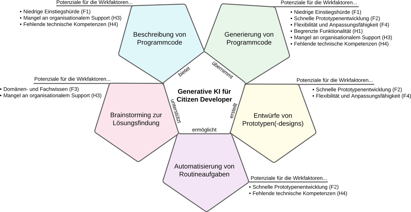 Im Rahmen der identifizierten Wirkfaktoren, insbesondere der Hemmfaktoren, ist auch ein Blick auf die technologischen Unterstützungsmöglichkeiten von genKI für CD vielversprechend. Es konnten fünf Anwendungsbereiche (siehe Abb. 5) erfasst werden, in denen CD durch genKI profitieren und Kompetenzlücken sowie Abhängigkeiten wie beispielsweise von der IT-Abteilung mindern können. Wie AlAfnan et al. (2023) zeigen, können genKI-Modellen konkrete Nachfragen über einen Programmcode gestellt und von diesen beantwortet werden, sodass ein direkter Lerneffekt entsteht. Die Wissensbasis großer genKI-Modelle enthält außerdem vorteilhaftes Wissen, von dem im Zuge der von genKI ausgegebenen Antworten profitiert werden kann (Bilgram und Laarmann 2023; Bahi et al. 2024). Vielversprechend ist auch die Nutzung von genKI für kreative Zwecke, da durch gezielte Fragen Vorschläge generiert werden können, welche die Findung von Problemlösungen und das Treffen von Entscheidungen unterstützen (von Brackel-Schmidt et al. 2023). Mit genKI kann zudem der Zugang zur Programmierung zusätzlich zu NLCPs durch die intuitive Kommunikation in natürlicher Sprache weiter vereinfacht werden (Martins et al. 2023; Bruhin et al. 2024). Es ist jedoch wichtig, eine Einordnung vorzunehmen: LCE kann deutlich von genKI profitieren, während NCE eher in geringerem Maße beeinflusst wird, wie die analysierten Artikel zu genKI aufzeigen. Auch ist anzumerken, dass auf Basis unserer Ergebnisse besonders Wirkfaktoren und Handlungsempfehlungen von genKI unterstützt werden können, die direkt oder indirekt die Kompetenzen von CD als Individuen betreffen.