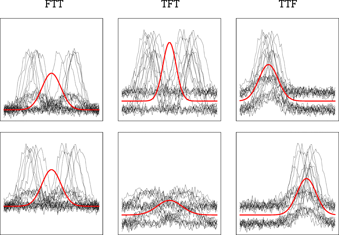 In the following, we refer to this model as TTF, to highlight that the third random effect is switched off. In the example illustrated in Fig. 2 this situation ideally leads to a two-cluster structure (Fig. 3, right panels). Similarly, if comparable time evolution curves associated to different intensities are seen as expressions of distinct groups, the random intercept αij,1 can be switched off, and we refer to this class of models as FTT. Lastly, removing αij,2 results in TFT models which would determine different blocks varying for a scale factor (Fig. 3, middle panels). From a practical standpoint, switching off a random effect amounts to constrain it to follow a degenerate distribution centered at zero in the estimation scheme outlined in the next section.