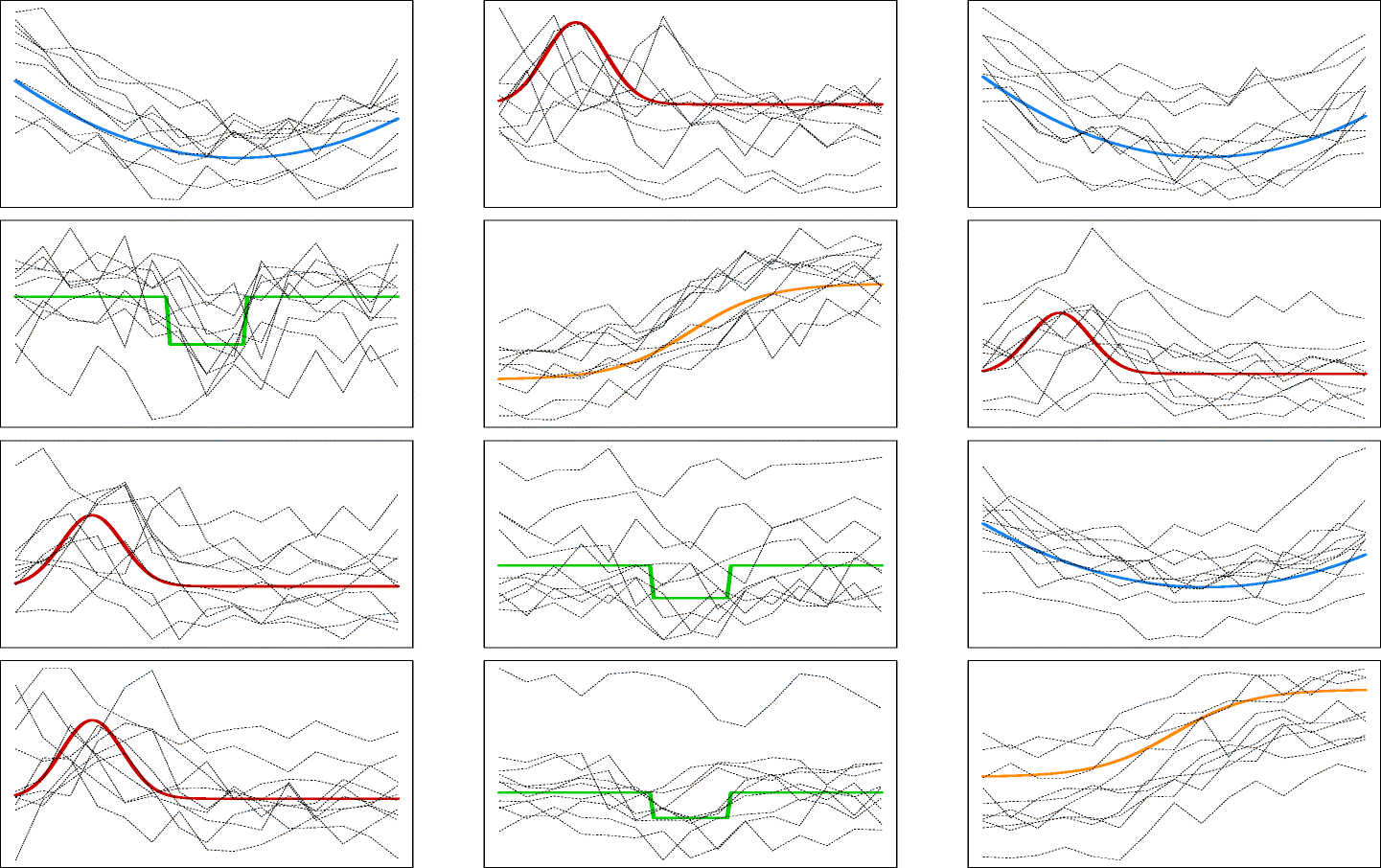 Note that here we embed the ideas borrowed from the curve registration framework in a clustering setting. Therefore, while curve alignment aims to synchronize the curves to estimate a common mean shape, in our setting the SIM works as a suitable tool to model the heterogeneity inside a block and to introduce a flexible notion of cluster. The rationale behind considering the SIM in a co-clustering framework consists in looking for blocks characterized by a different mean shape function m(⋅;βkl). Curves within the same block arise as random shifts and scale transformations of m(⋅;βkl), driven by the block-specifically distributed random effects. Let consider the small panels on the left side of Fig. 2, displaying a number of curves which arise as transformations induced by non-zero values of αij,1, αij,2, or αij,3. Beyond the sample variability, the curves differ for a (phase) random shift on the x −axes, an amplitude shift on the y-axes, and a scale factor. According to model Eq. 3, all those curves belong to the same cluster, since they share the same mean shape function (Fig. 2, right panel).