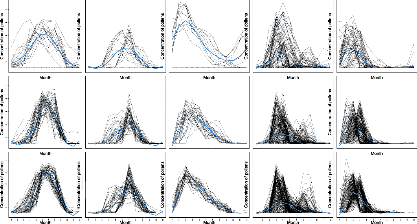 French pollen data results. Curves belonging to each single block with superimposed the corresponding block specific mean curve (in light blue)