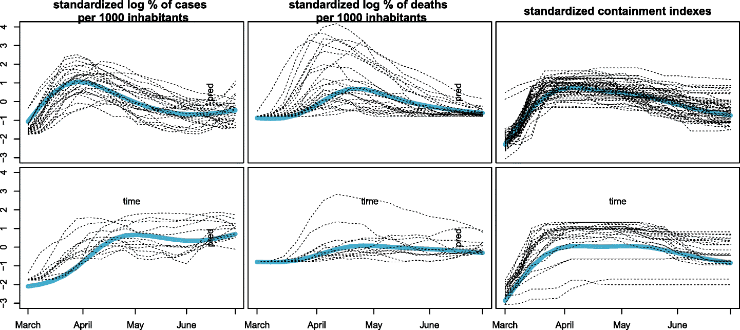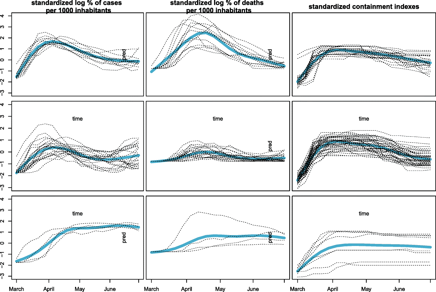 The resulting dataset is a matrix with n = 38 rows (countries), d= 4 columns (variables describing the pandemic evolution and containment), observed over a period of T = 18 weeks. Unlike the French pollen data, here there is no strong reason to favour one random effect configuration over the others. Conversely, different configurations of random effects would entail different ideas of similarity of virus evolution. Thus, while the presence of random effects would lead to a clustering of similar trends associated to different intensities, speed of evolution and time of onset, switching the random effects off could result in enhancing such differences via the separation of the trends.