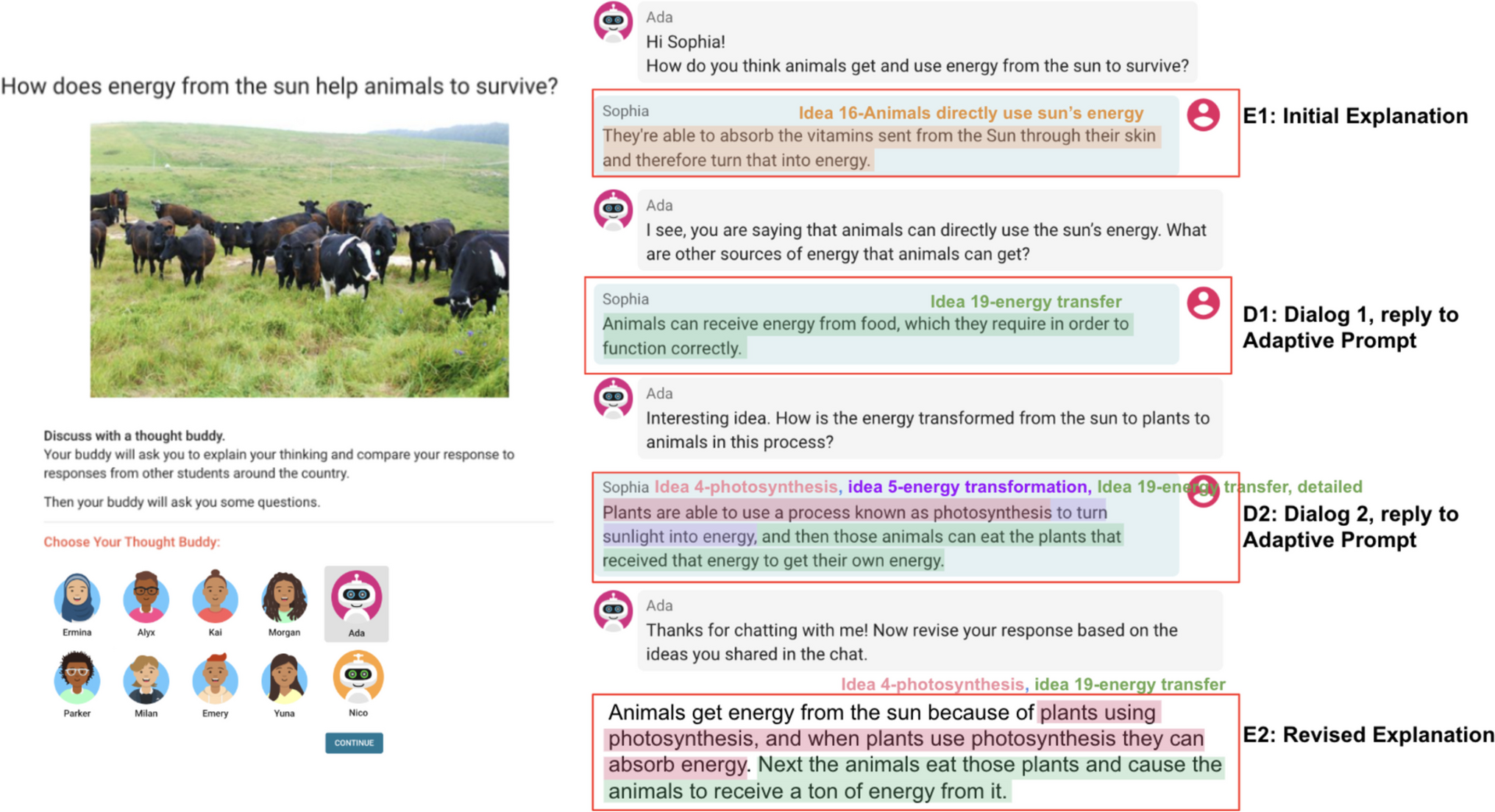 NLP adaptive dialog between Ada (a thought-buddy) and Sophia (a 7th-grade student)