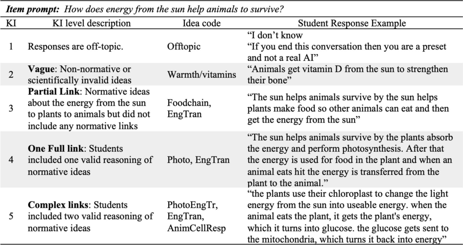 The KI framework emphasizes that students intentionally make sense of their everyday experiences, instruction, and interactions with others to develop numerous ideas about any phenomenon (diSessa, 2018; Linn & Eylon, 2011; Sayary et al., 2015). As a result, students develop a repertoire of ideas that includes broad, intuitive, mechanistic, and non-normative ideas. Consistent with constructivist views, the KI framework offers design principles for instruction that build on student ideas, encouraging them to explore their ideas, discover new ideas, distinguish their ideas from those of others, and reflect on the varied perspectives they hold (Linn et al., 2023). When teaching for KI, teachers affirm student ideas and invite them to explore the connections among their ideas. They encourage students to analyze their own ideas rather than describing ideas as misconceptions (Gerard, Bradford, et al., 2022a, 2022b; Otero, 2006). KI assessments measure the degree to which students combine their ideas into coherent arguments to explain complex scientific phenomena. KI levels reward students for using evidence to explain scientific concepts and phenomena such as global climate change and photosynthesis (Bradford et al., 2023; Gerard et al., 2022a; Ryoo & Linn, 2015). These assessments are scored for the level of KI on a 1 to 5 scale.