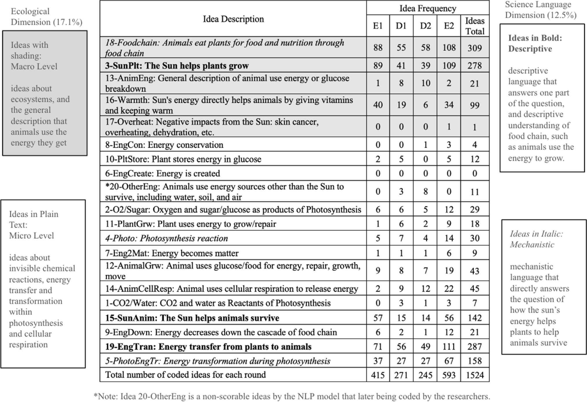 Students expressed fewer ideas in response to the two dialog prompts, with 271 ideas at Dialog 1 (D1) and 245 at Dialog 2(D2), consistent with the design of the prompt to focus on one idea. The most frequent idea at D1 is “Energy transfer” (EngTran), while the most frequent idea at D2 is “Animals eating plants as food and nutrition” (Foodchain).