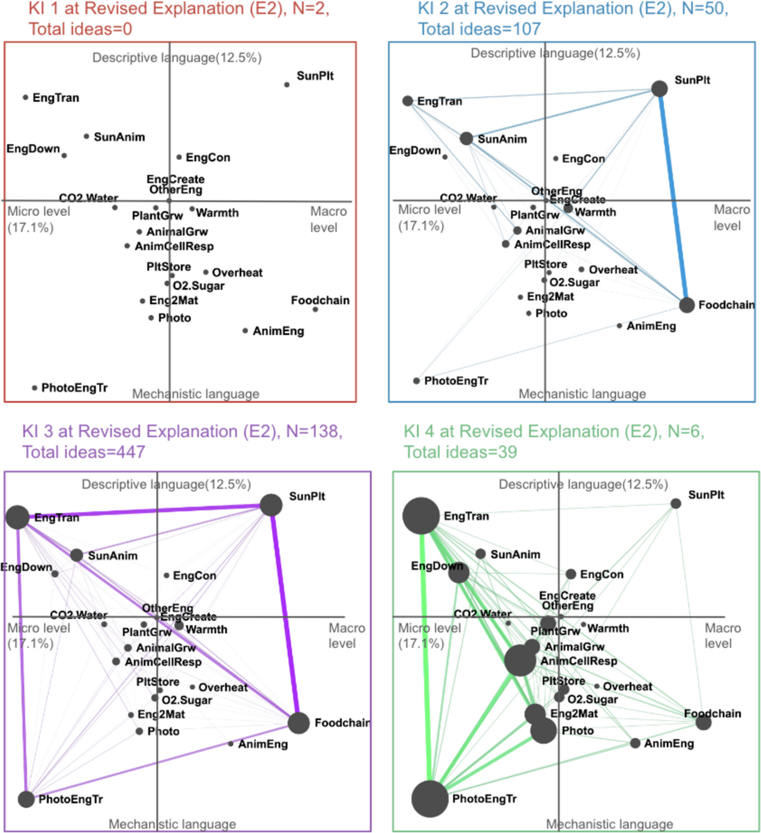 Idea network ENA models for responses at each KI level on the final explanation (idea labels are shown in Fig. 5)