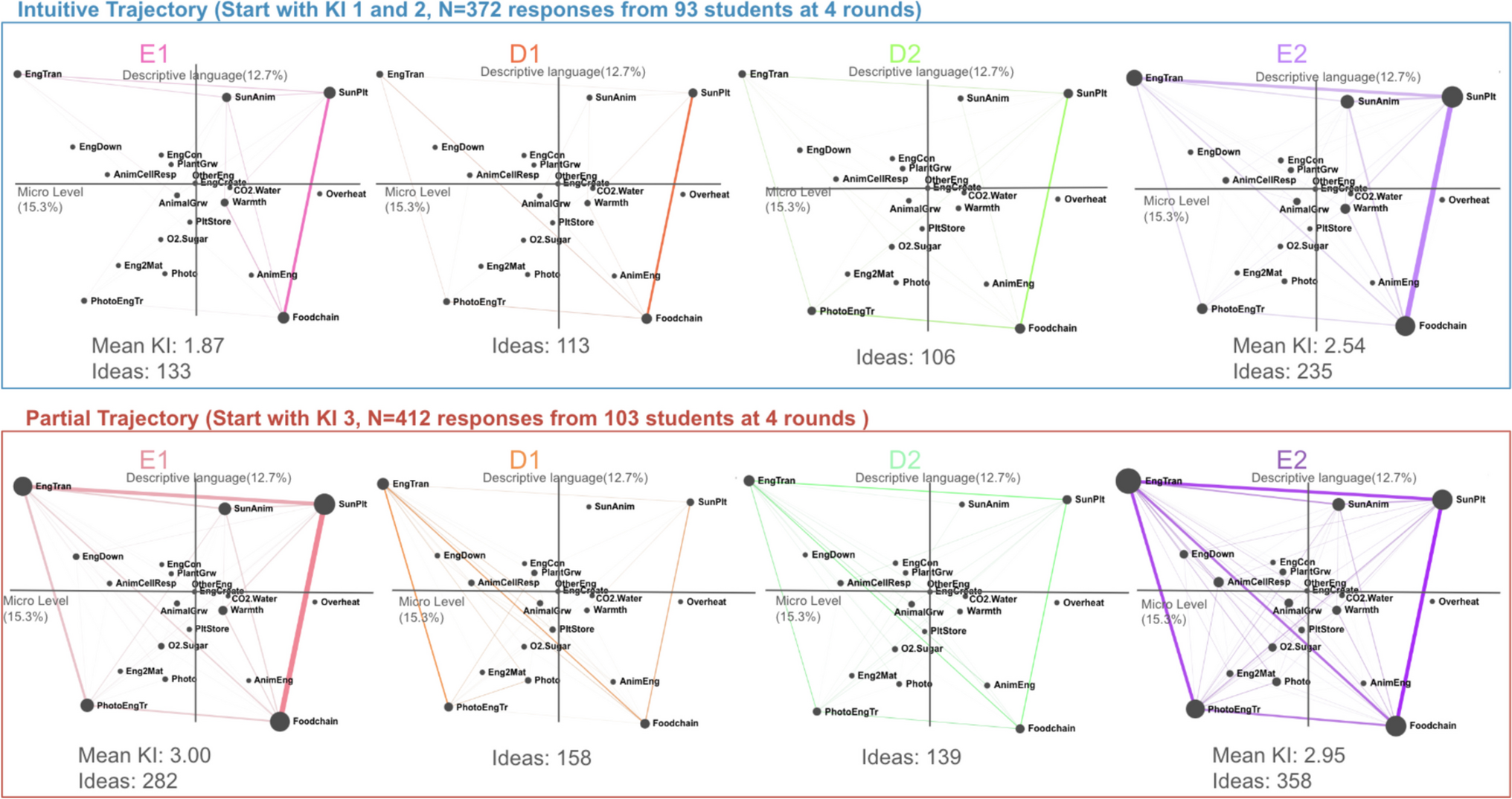 For instance, in Fig. 7-Partial Trajectory-D1, they used scientific mechanisms of light energy being transformed into chemical energy during photosynthesis (PhotoEngTr) to connect to how animals get energy from plants when they eat them (EngTran). The links of these mechanistic ideas are thicker compared to E1. This suggests that some students link to the micro level by adding details of energy transfer after receiving an adaptive prompt. In Fig. 7-Partial Trajectory-D2, students connect the micro and macro levels more often compared to D1, such as the link between Energy Transfer (EngTran) and the Sun helps plants survive (SunPlt) and Energy transformation in photosynthesis (PhotoEngTr) and Foodchain. To connect these ideas, students think about both the transfer of matter and the transformation of energy along the food chain when animals eat plants. In Fig. 7-Partial Trajectory-E2, students continued adding more microscopic ideas to the links but did not continue linking mechanistic ideas. The ENA shows that the students made many links between macro and micro levels, using descriptive language rather than mechanistic language, which explains why the mean for this group remains at the KI 3 level.