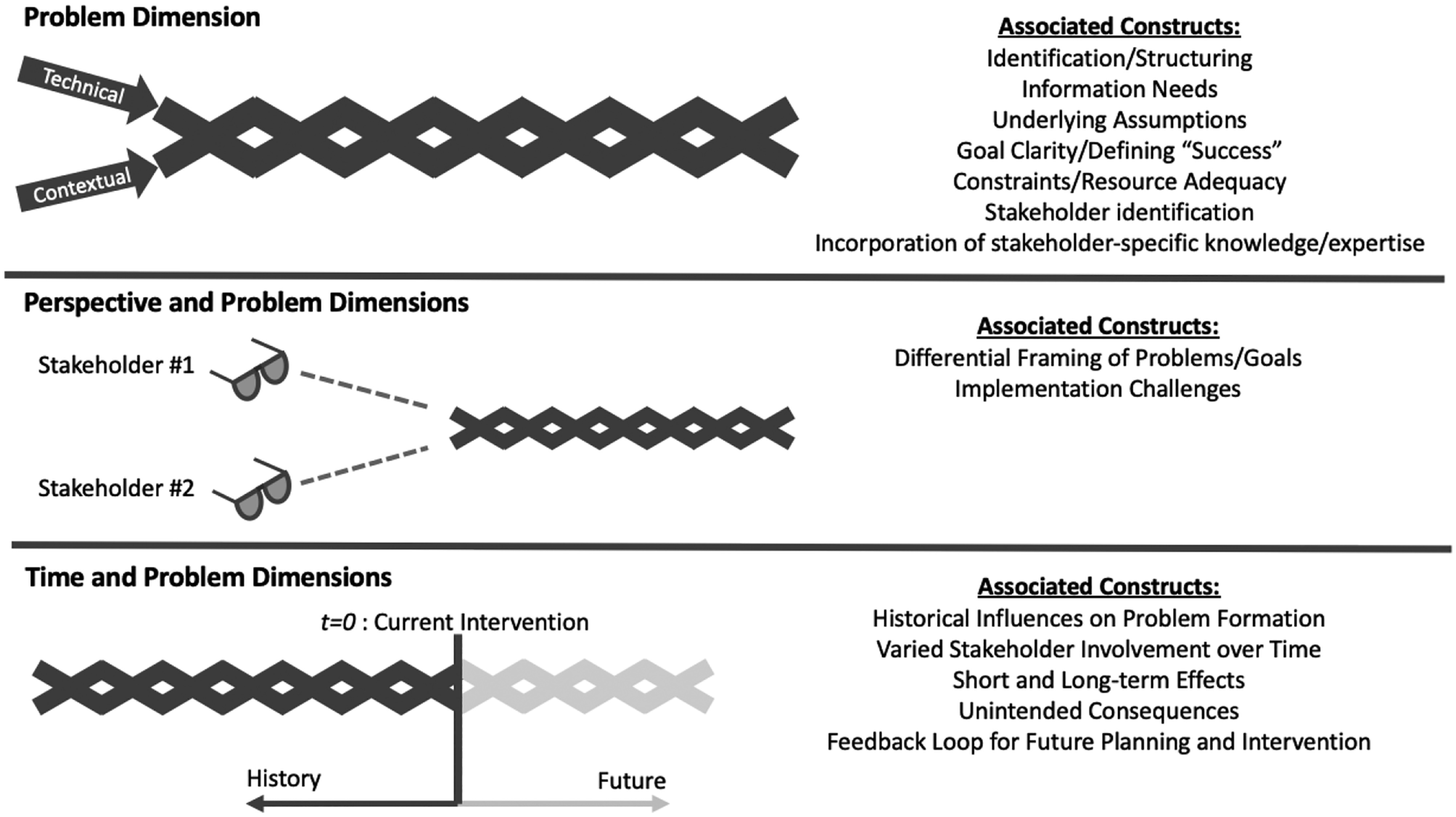 Grohs et al. (2018) describe a three-dimensional framework of systems thinking (Fig. 1). The problem dimension considers both technical elements and contexts in analyzing a complex problem, including assumptions, goals, and constraints. The perspective dimension considers multiple perspectives or “frames” of the problem across potential stakeholders. The time dimension considers the history of a situation and considers potential short- and long-term unexpected consequences of each possible action.