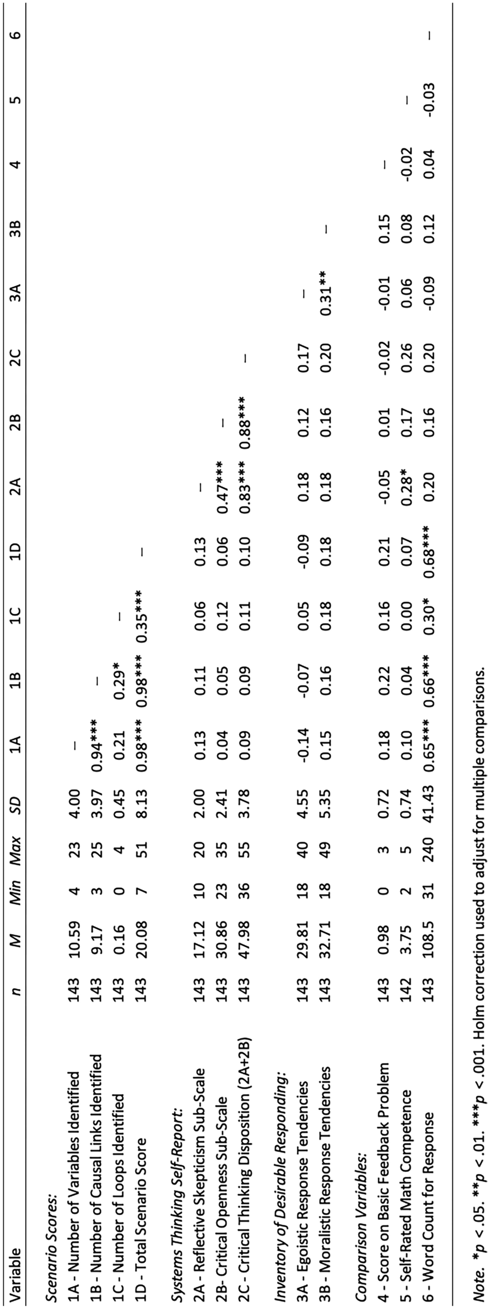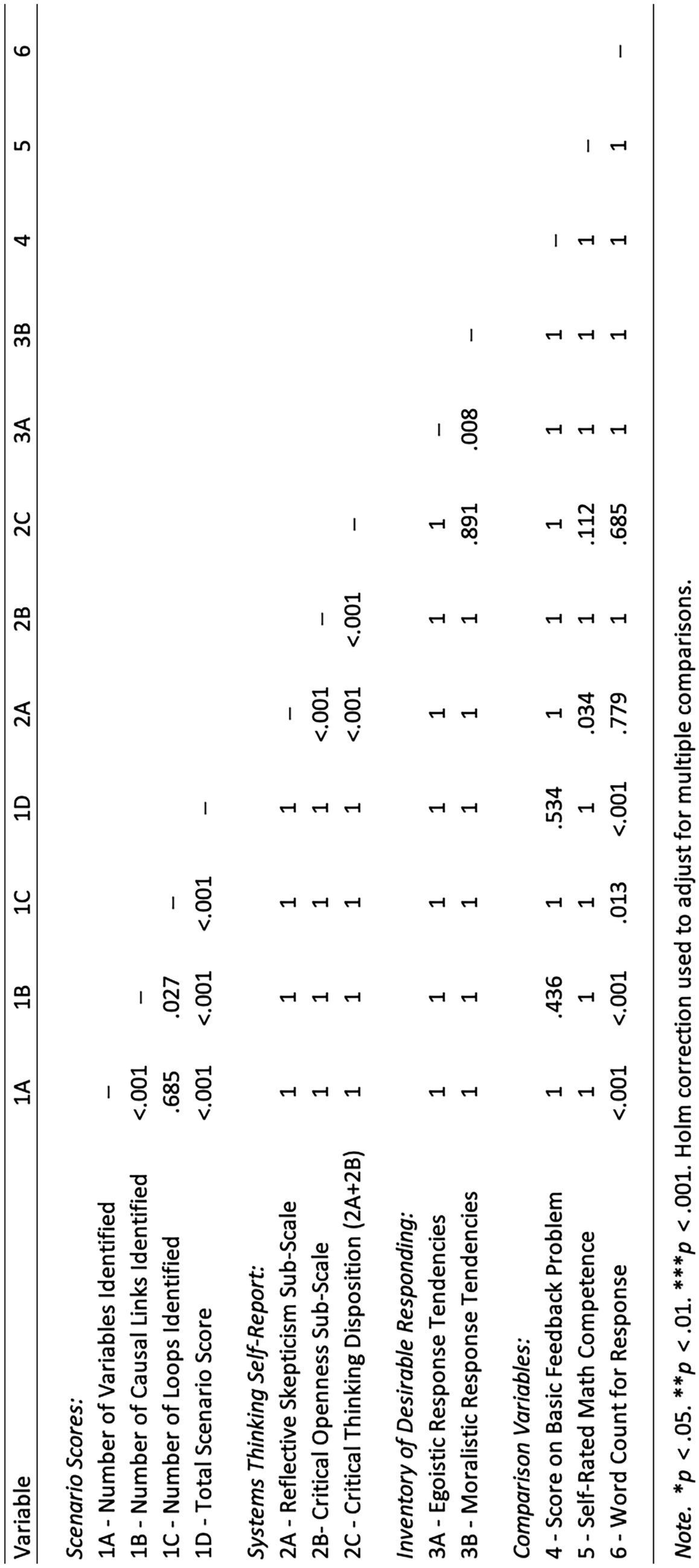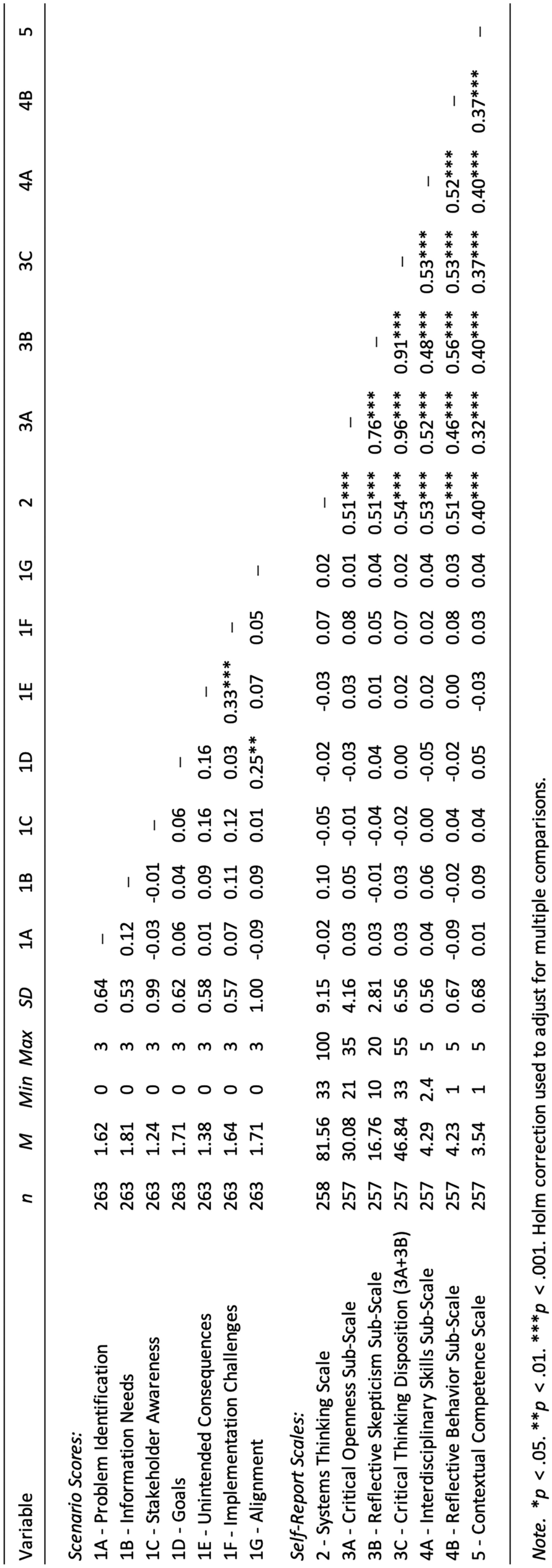 We conducted both correlation and regression analyses. First, we calculated a correlation matrix comparing the scenario assessment scores with the total scores and scale and/or sub-scale scores for each of the self-report assessments. Because we made multiple comparisons, we adjusted p values for family-wise error rate using the Holm correction, choosing this option because it provides a balance between reducing the risk of Type I errors and maintaining statistical power (Field et al., 2012). Although much of our data are Likert-scale survey responses, we used the Pearson correlation method as this has been shown to be robust for use with both ordinal and non-normal data (Norman, 2010). Next, we conducted multiple regression analyses with the scenario scores as the dependent variable and the systems thinking self-report scores as the independent variables. For each regression analysis, we checked for multicollinearity using the variance inflation factor (VIF) and for independent errors using the Durbin-Watson test. All VIF values were under 2 and Durbin-Watson values were between 1.75 and 2.25, both of which are well within the recommended values (Field et al., 2012).