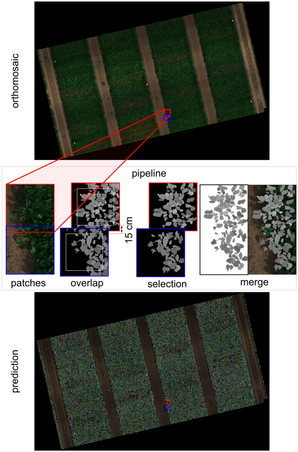 Prediction on large images: Orthomosaic images from UAV-imagery outrun current GPUs capacity for prediction. To extend the model application to a large image from a complete mapped field, we use a sliding windows procedure (Fig. 2). For this purpose and as proposed by Machefer et al. [24], we crop the RGB composite orthomosaic image (I) in patches with an overlap (15 cm or 60 px, o) between neighbours. We use the segmentation model to predict leave instances sequentially on each patch; and eliminate instances with 100% cover in the overlap region. After selection, we reconstruct the remaining leaves in a new orthomosaic image (\(I_{leaf}\)). Algorithm 1 shows the procedure.