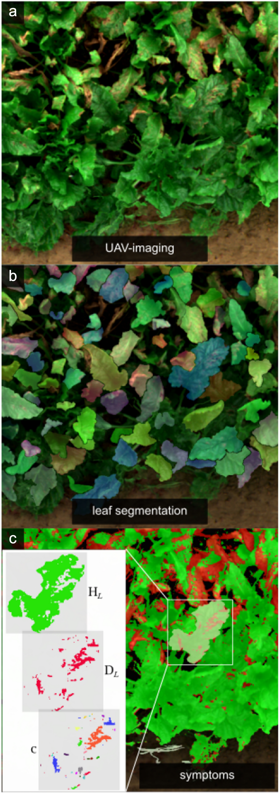 Prediction of disease quantification parameters by application of leaf segmentation. a RGB composite of diseased plants, b segmentation of leaves, and c multiclass pixel-classification and parameter extraction of leaf instances as healthy region (\(H_{L}\)), diseased region (\(D_{L}\)), and number of clusters within a leaf (c)