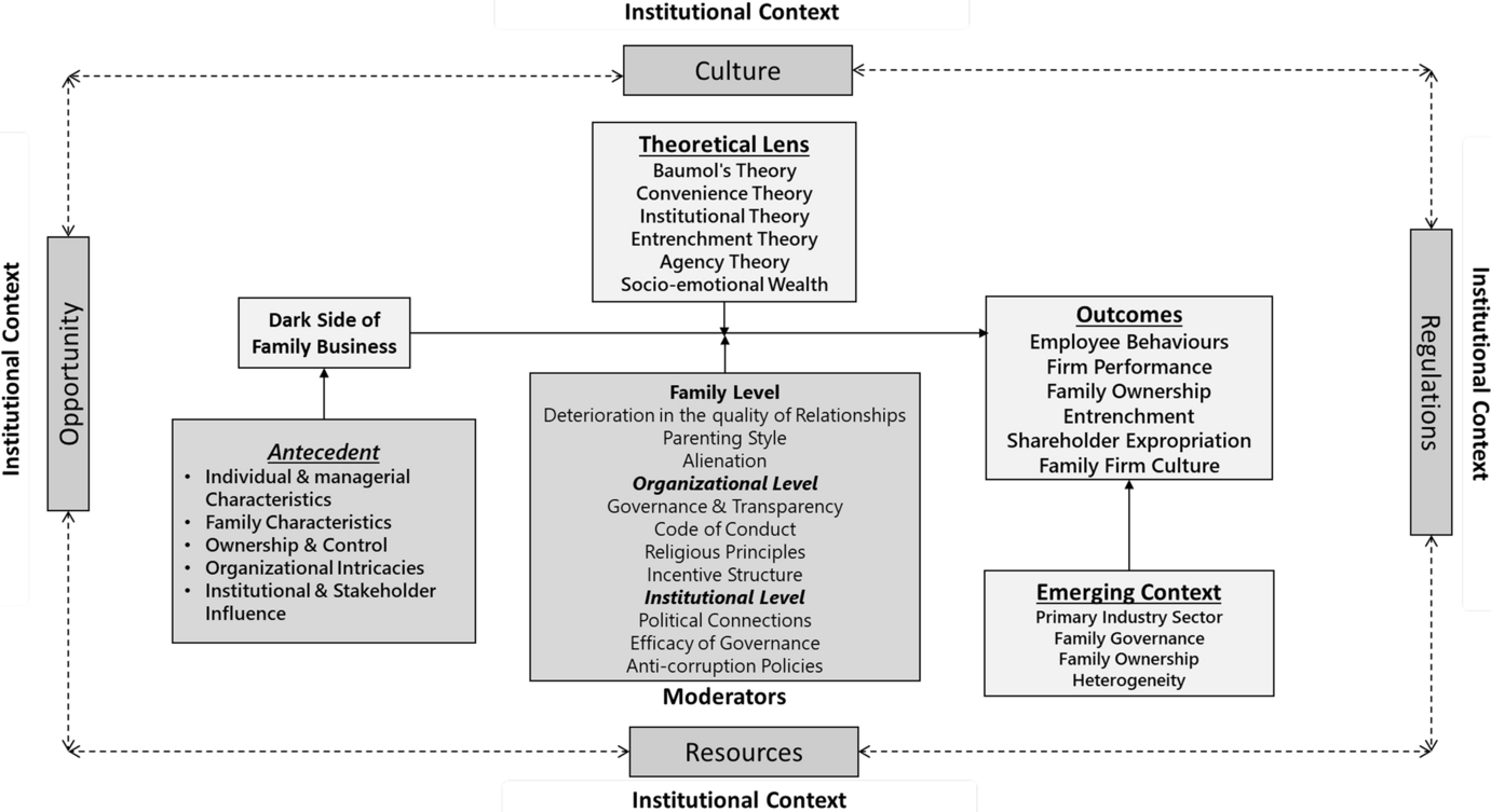 For instance, Montiel Mendez and Soto Maciel’s (2021) model of the dark side of family business recognized the intricate relationship between external influences, family dynamics, organizational practices, and the founder’s individual characteristics—our model, however, compliments and goes beyond and acknowledges the necessity of a structured approach to the examination of these dark aspects, which encompass governance concerns, conflicts, and other obstacles within family-owned enterprises. Montiel Mendez and Soto Maciel (2021) draw attention to the two primary dimensions—entrepreneur/founder and family dynamics—through which dark behaviors have manifested. They stress the interplay between personal characteristics, family relationships, and environmental contexts to shape these dynamics. This approach challenges conventional divisions between family and business by adopting a relational perspective.