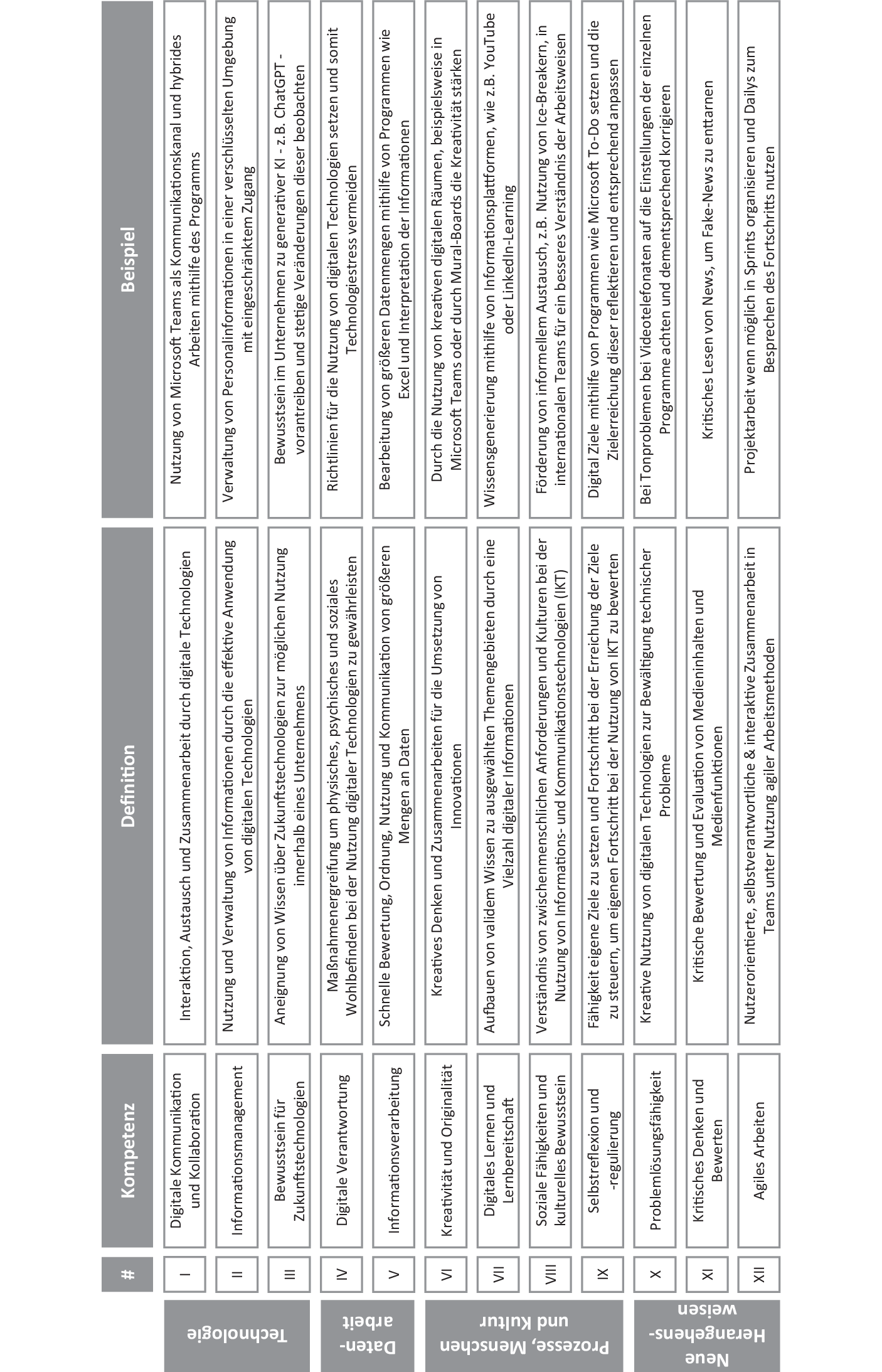 In Abb. 2 sind die zwölf Digitalkompetenzen einem Handlungsbereich nach Chamorro-Premuzic (2021) zugeordnet, mit römischen Ziffern nummeriert, jeweils kurz definiert und für das Verständnis mit einem Beispiel erläutert. Es finden sich die Digitalkompetenzen (I) Digitale Kommunikation und Kollaboration, (II) Informationsmanagement und (III) Bewusstsein für Zukunftstechnologien in dem Handlungsbereich Technologie wieder. Zu dem Handlungsbereich Datenverarbeitung zählen (IV) Digitale Verantwortung und (V) Informationsverarbeitung. Zu Prozesse, Menschen und Kultur sind die meisten Digitalkompetenzen zugeordnet: (VI) Kreativität und Originalität, (VII) Digitales Lernen und Lernbereitschaft, (VIII) Soziale Fähigkeiten und kulturelles Bewusstsein und zuletzt (IX) Selbstreflexion und -regulierung. Dem Handlungsbereich Neue Herangehensweisen gehören die Digitalkompetenzen (X) Problemlösungsfähigkeit, (XI) Kritisches Denken und Bewerten und (XII) Agiles Arbeiten an. Die Zuordnung zu den Handlungsbereichen erfolgte aufgrund der für diesen Beitrag gewählten Definitionen der einzelnen Digitalkompetenzen. Dieses Vorgehen wurde angewandt, um Mehrfachzuordnungen zu vermeiden.