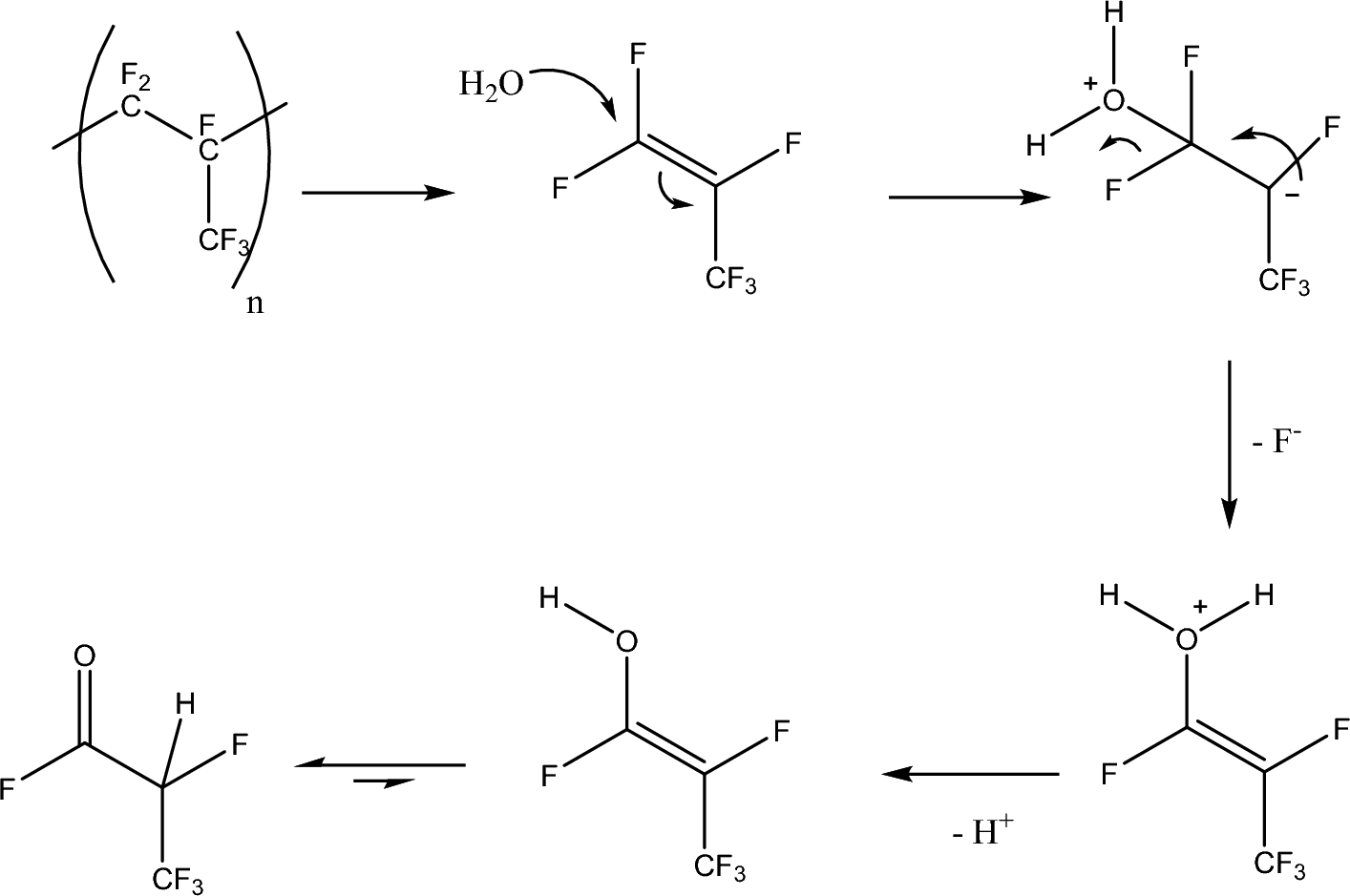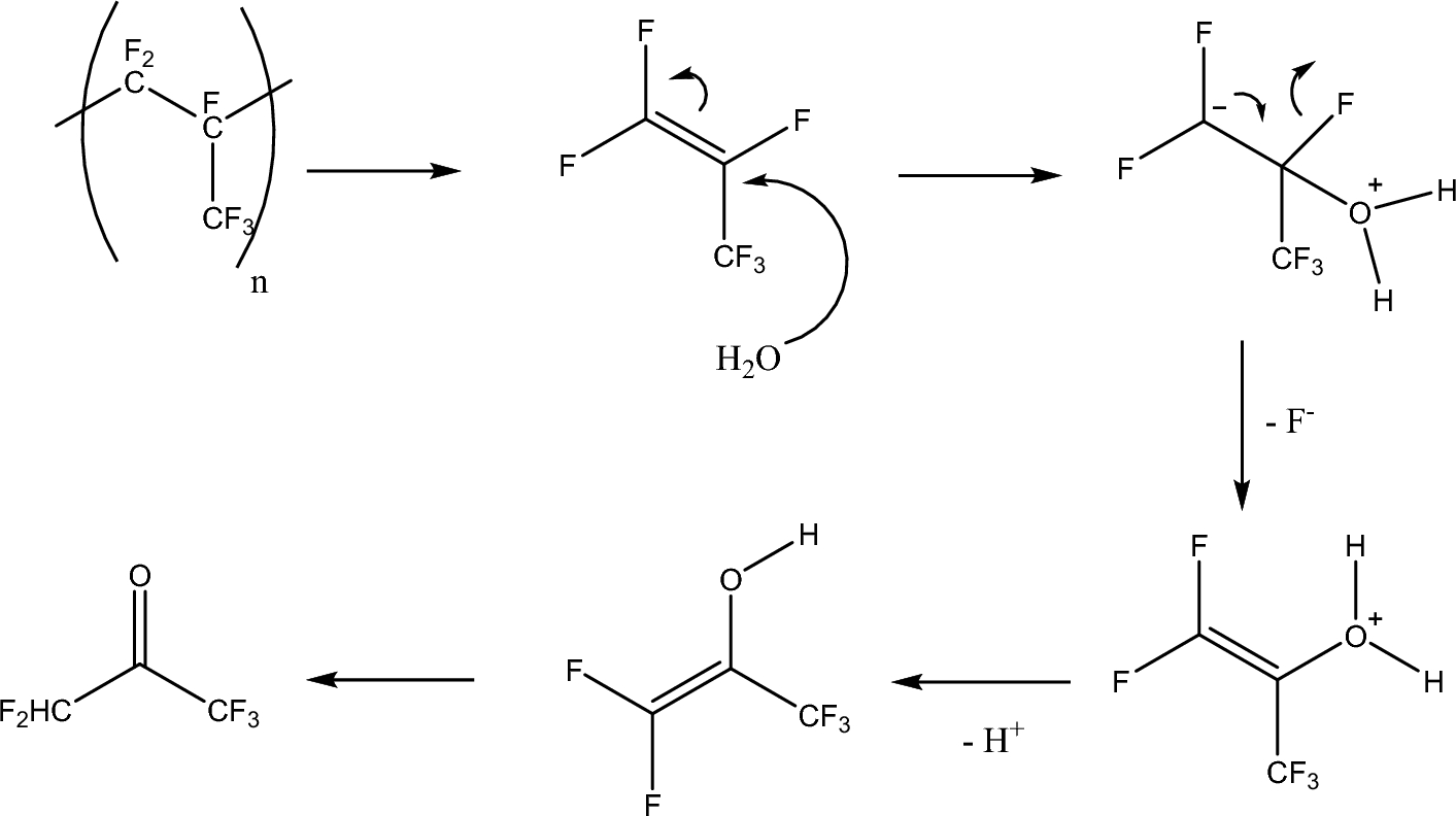 A combination of 1,1-difluoroethene and hexafluoropropene can be used to form a fluoroelastomer. When heated in a quartz tube to between 700°C or 900°C, smaller molecules are produced [31]. These can include the monomer which is reformed by thermally cracking the polymer. While normal alkenes are well known to undergo attack of electrophiles (electron seeking species) on the electron rich pi system of the alkene. For the highly fluorinated alkenes such as tetrafluoroethylene and hexafluoroisobutylene it is possible that they could cause similar lung injuries to those caused by phosgene. This is due to the fact that they are able to act as electrophiles on nucleophiles such as alkoxides. During the pyrolysis of the fluorinated polymer, it is likely that nucleophilic species such as water will be present. For example, if tetrafluoroethylene is combined with sodium ethoxide then it forms 1,1,2-trifluoro-2-ethoxyethene at room temperature [32]. It can be reasoned at the higher temperature that a neutral alcohol or water will be able to act as a nucleophile on the trifluoroalkene. This reaction will form both protons and fluoride anions as the side product. Thus, it will be able to form hydrogen fluoride. A possible mechanism of the reaction is proposed in Figure 2, which shows that the nucleophile attacks at the less electron poor carbon and ultimately forms pentafluoroacetone.