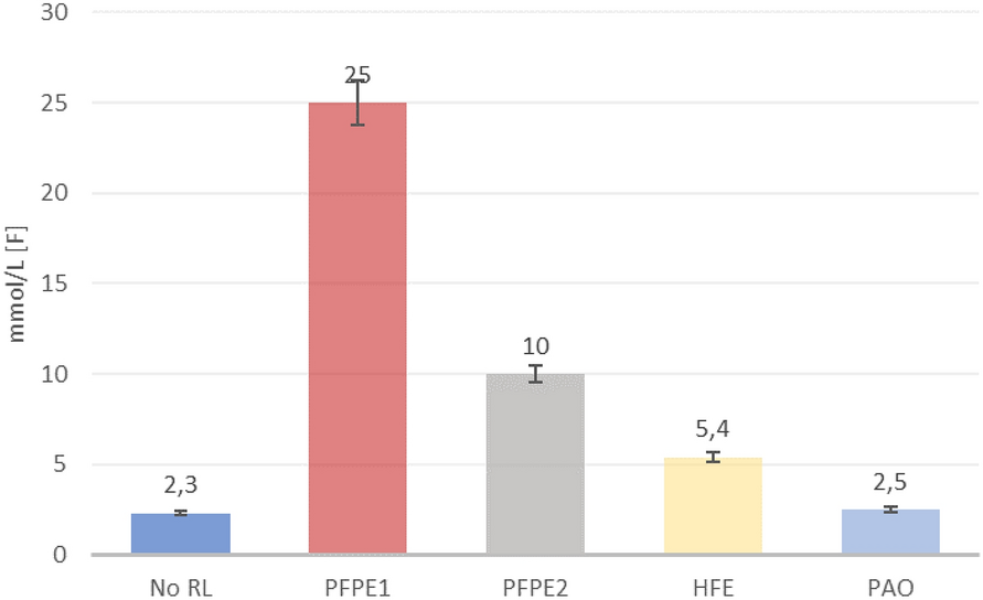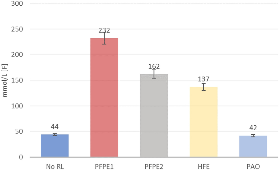 The concentration of fluorine in the refrigeration liquids as determined through a combustion ion chromatographic analysis is shown in Table 1. PFPE1 and PFPE2 had the highest fluorine concentration. There was a very low concentration of fluorine detected in PAO.