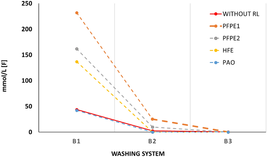 The pH of the Milli Q water used to wash the off-gas varied depending on which RL was used (Table 3). This indicates the presence of hydrogen ions, most probably from HF. The pH increased from B1 to B3 for PFPE1, PFPE2, and HFE, corresponding to a decrease in F concentration in the washing solutions as shown in Table 2. The pH measured for PAO and for the LiBs thermal treated without refrigeration liquids has similar values in B1. In B2 and B3, RL 4 has a higher pH than LiBs without RL. Since PAO contains a negligible amount of F, this decrease is explained by the formation of other substances than HF.