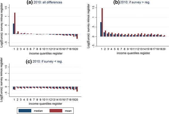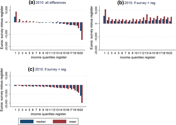 In 2010, the median of the relative deviation [(survey minus register)/register × 100] amounts to 16% (employee income), 52% (unemployment benefits), 9% (old-age benefits).
