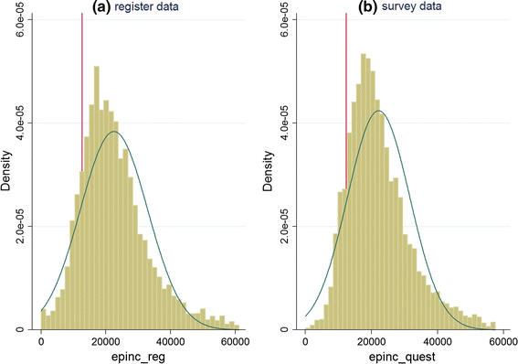 This bandwidth was chosen as there are hardly any households for which a perfectly identical equivalised income between the two data sources is observed (Table 5 in the “Appendix”).