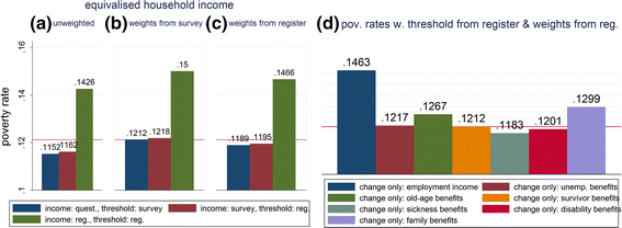 A smaller number of studies are concerned with total household income and the consequences of using register data instead of survey data for the calculation of household income and poverty indicators. The studies available also differ in their validation methodology. In sum, the measurement error of income has been shown to affect cross-sectional poverty rates (Nordberg et al. 2001; Figari et al. 2012), poverty dynamics (Rendtel et al. 1998; McGarry 1995; Breen and Moisio 2004; Worts et al. 2010) and statistical relationships of poverty indicators with other variables (Lohmann 2011). Nordberg et al. (2001) found that income estimates derived from administrative records are quite reliable and generally higher than surveyed income, except for very low register incomes. They interpreted the differences observed as being mainly due to measurement errors in the interview data. Their results showed that survey data produced higher inequality and poverty estimates than register data. Lohmann (2011) makes use of between-country differences concerning data sources for income variables (register or survey data). Results show that the degree of consistency between earnings and employment status (i.e. no earnings reported if the status is non-working) is on average lower in register countries; this also impacts on the poverty rate conditional on activity status in some countries. The author concludes that the relationship between employment status and poverty status also depends on the data collection approach used. Figari et al. (2012) compare empirical estimates of income distribution and poverty rates based on microsimulation methods with observed survey-data-based estimates. The authors use simulated estimates in their model in accordance with prevailing rules on liability and eligibility in four European countries. On the one hand, their results show that poverty rates, defined as the number of people with equalized incomes less than 60% of the national median, which use reported data are slightly higher than those calculated using simulated incomes. On the other hand, there was an overlap of 75% for both approaches.