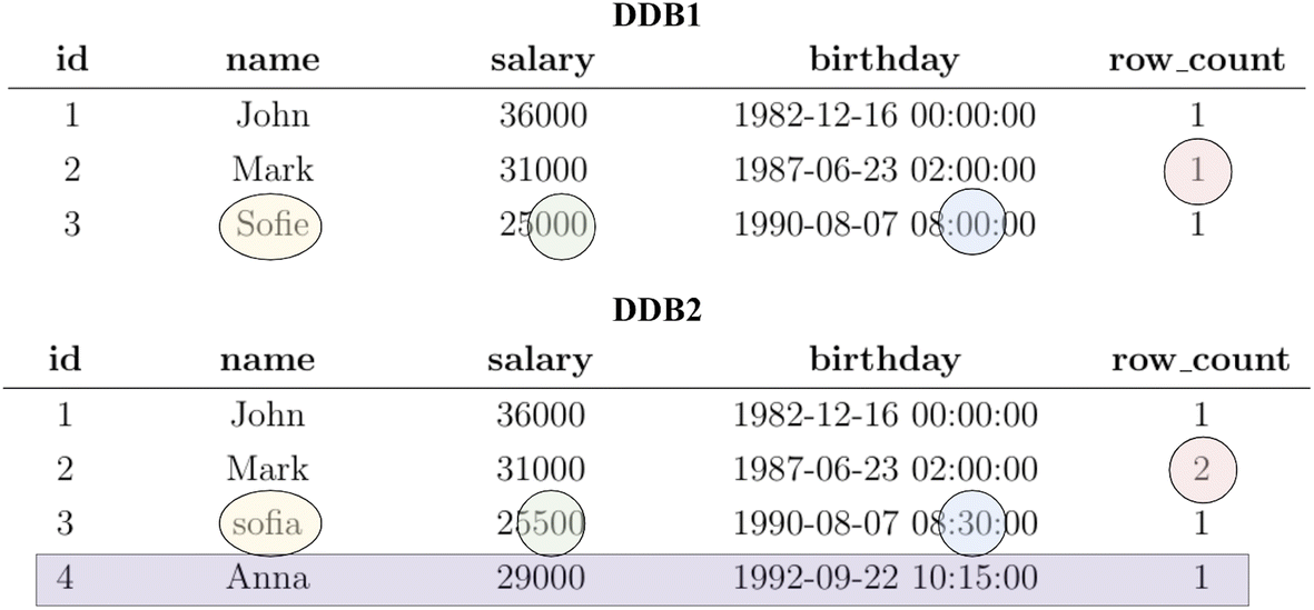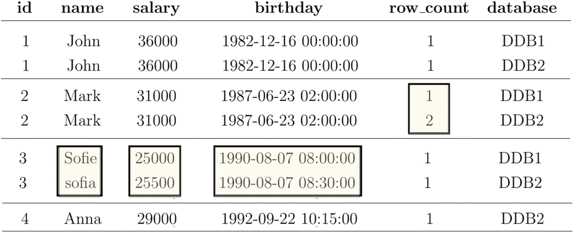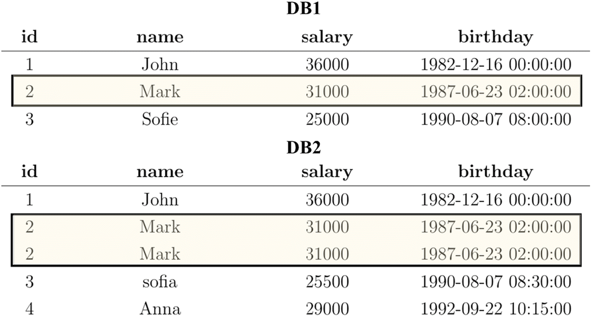 Our running example consists of two databases “DB1" and “DB2" with identical schemas that are to be validated. Each database contains a table named “Users" with four columns (id, name, salary, and birthday) as displayed in Table 1, while Fig. 4 shows the data in the “Users" table present in both databases.