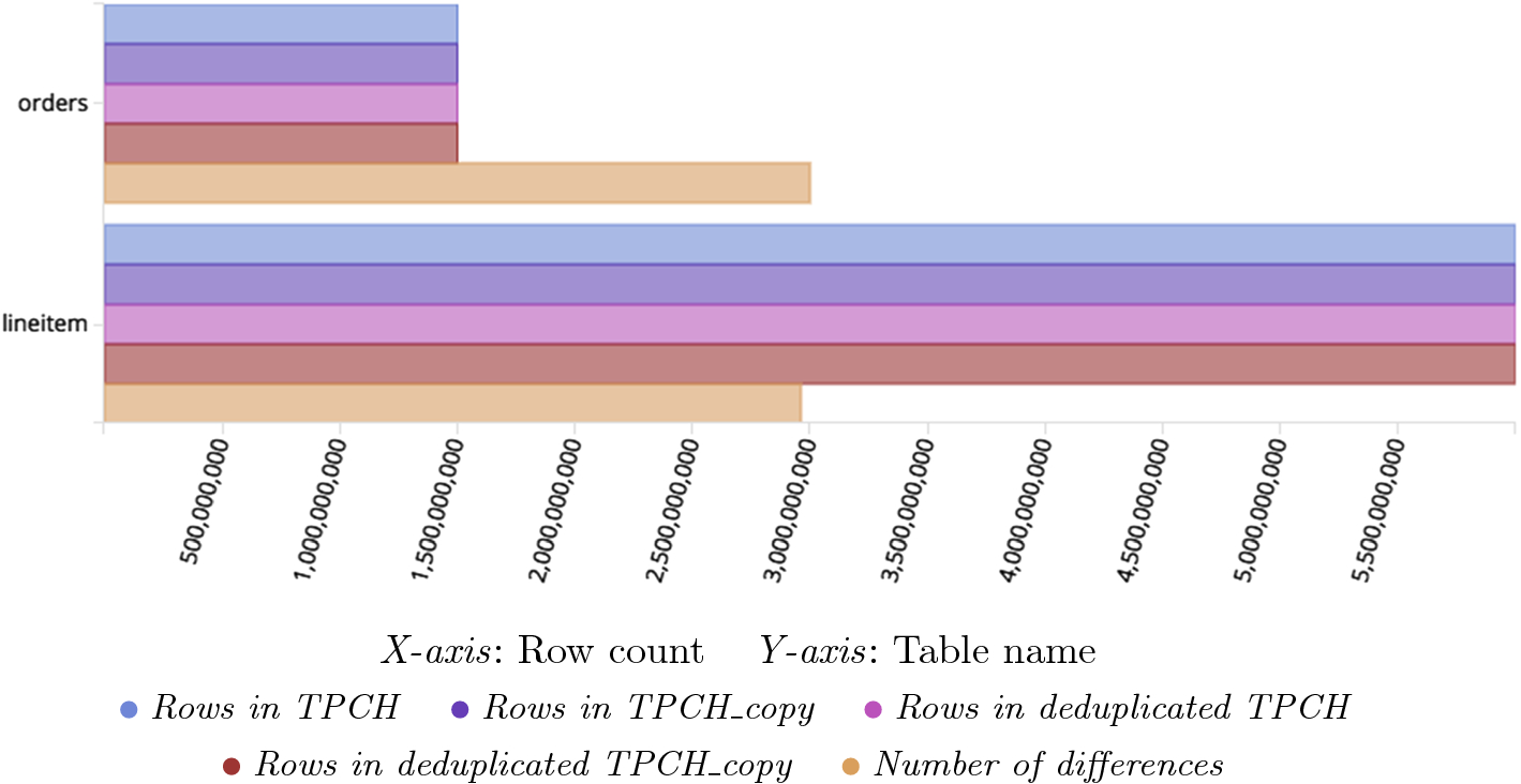 It is notable that the measurement of the deduplication stage is similar in both test cases as the same database structures were used and only a few more rows were added to the data in the second case. However, the row validation step took longer compared to the first case since differences were detected and row statistics were calculated and generated. As for the column validation step, there was no time added for the first test case since no differences were found, while statistics were generated for both “LineItem" and “Orders" tables in the second case resulting in more time being added to the total number of milliseconds.