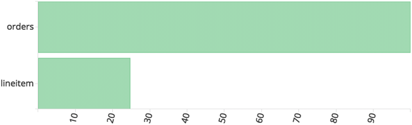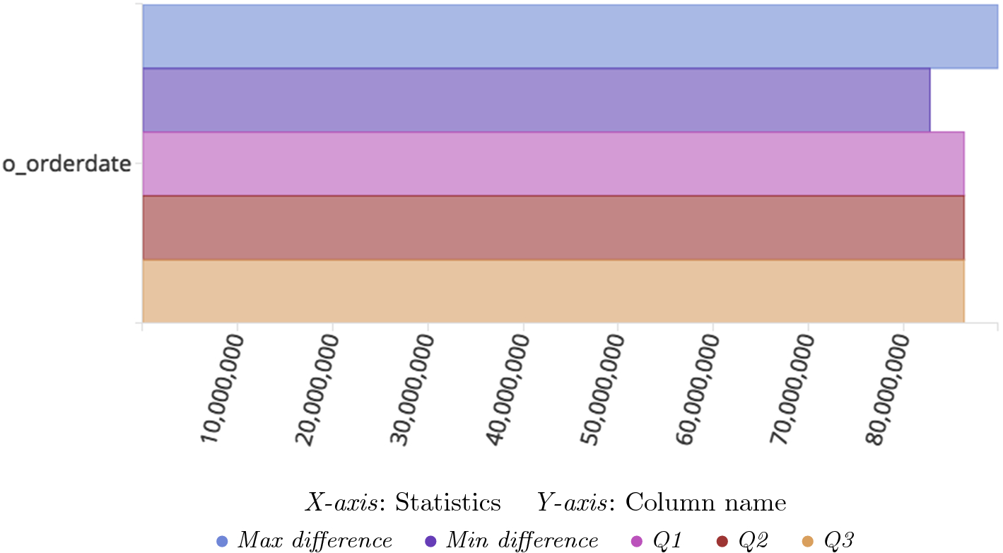Similarly, it can be seen that there is 100% difference regarding the table “Orders" while no new rows were added and no rows were duplicated. In other words, all existing rows in the “TPCH" database table are different from the related ones in the “TPCH_copy" database, and this is due to the change that was made on all dates in the “O_orderdate" column. As the results indicate, there is clearly a need to execute the column validation step in both tables “LineItem" and “Orders" in order to get more detailed insights regarding the changes that have occurred.