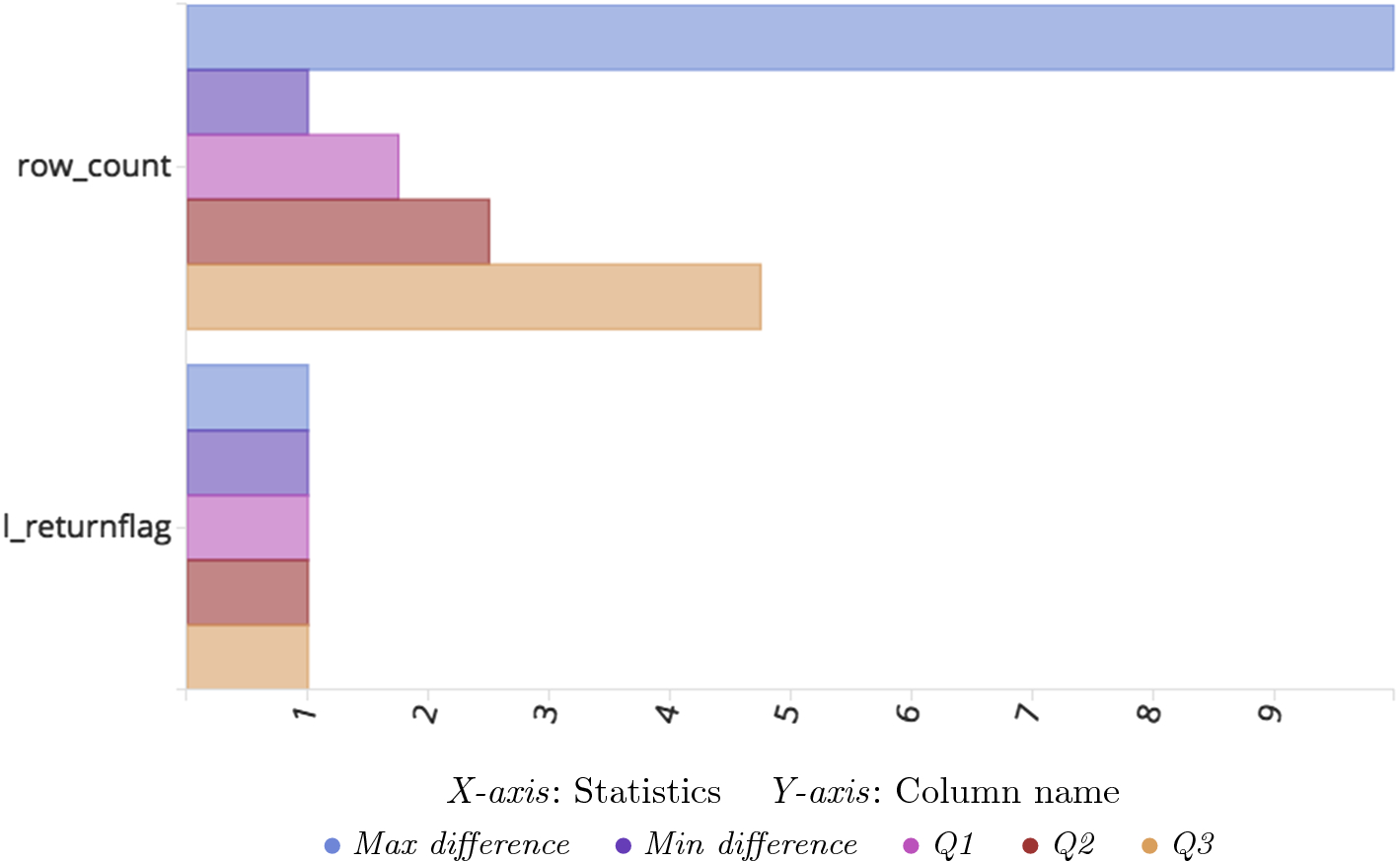 Column statistics The result of the row validation stage indicates which columns should be further investigated. In Table 11, the total number of differences that were caused by uncapitalising a letter in the “LineItem" table is reflected, with a minimum and maximum of 1, which means that only one letter has changed. In addition, the four duplication operations are also listed with a range from 1 to 10. The quartile values here give a good measure of the distribution of data, as it shows that smaller number of row duplications have occurred in general even if the maximum value is 10, which is correct considering how the data was spread in this example (1, 2, 3, and 10).